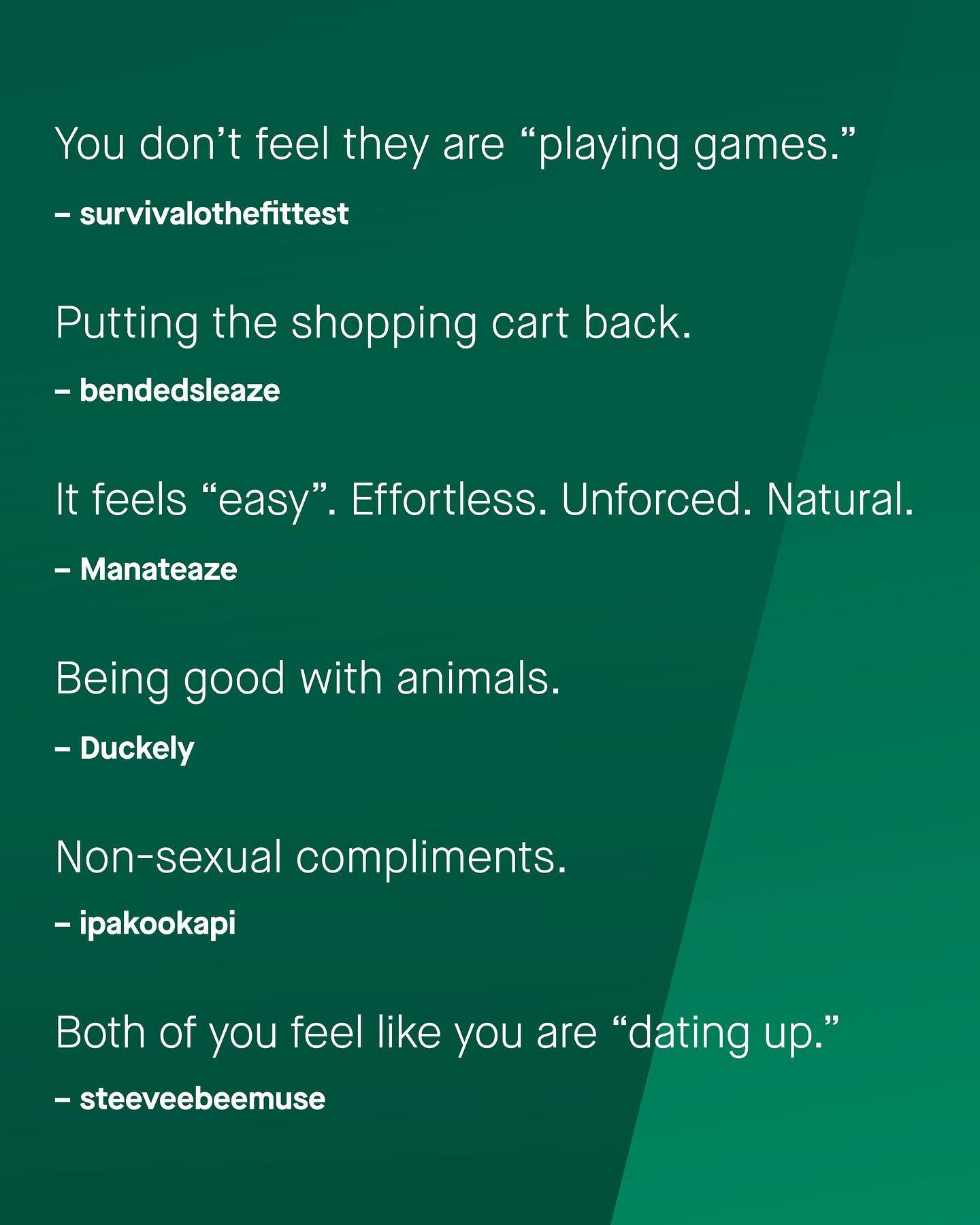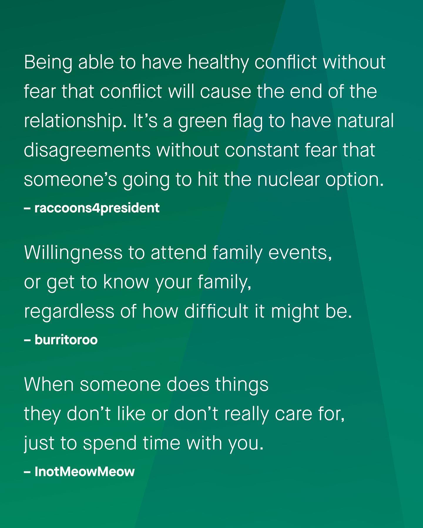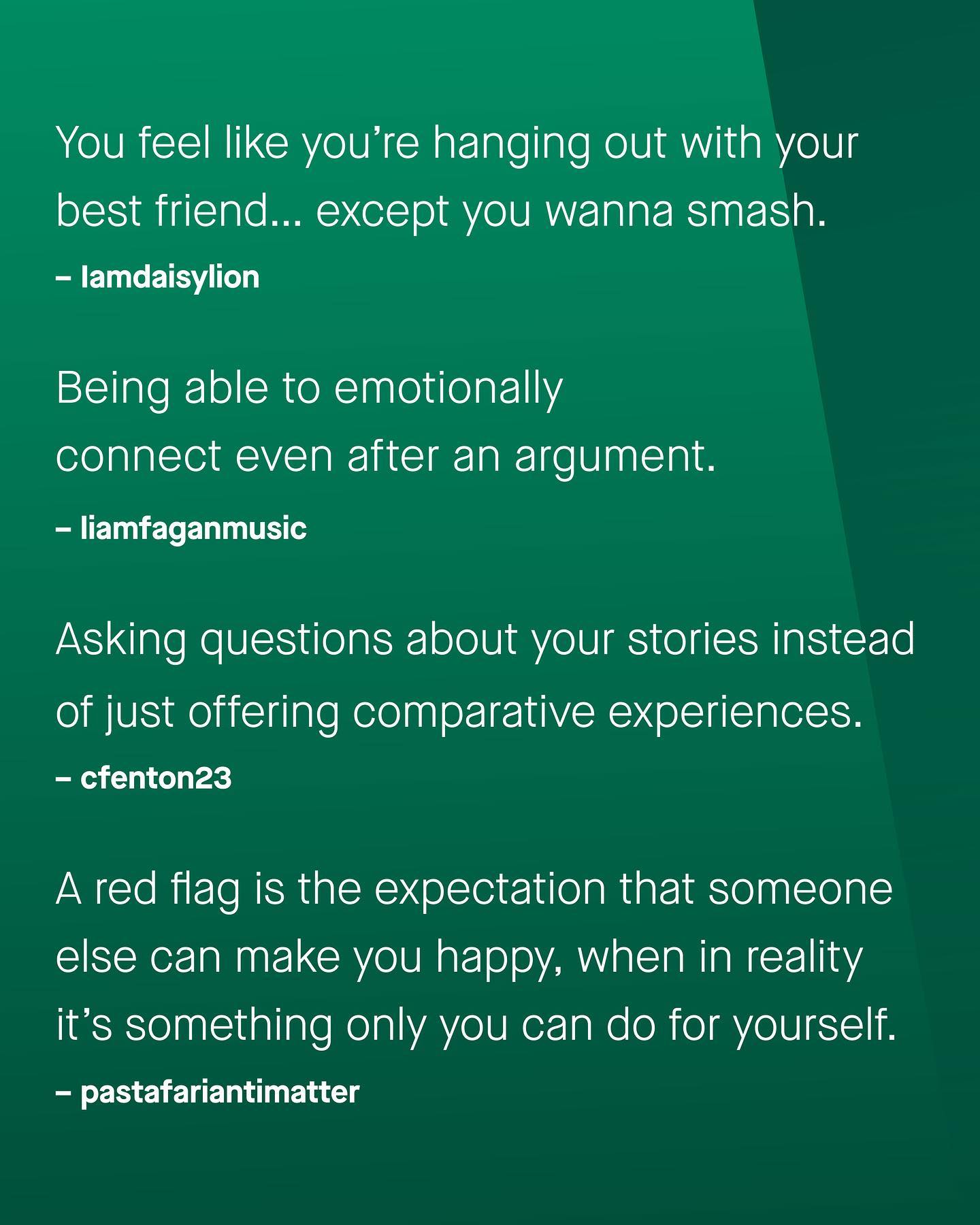 When it comes to dating and relationships, we are frequently warned of the many red flags to watch out for. But so rarely does discussion ever talk about the green flags; the signs of kindness, competency, affection and commitment that are no less important to spot. So tell me – what are the green flags you look out for? ~ #datingadvice #relationshipgoals #datingtips #relationshipadvice
