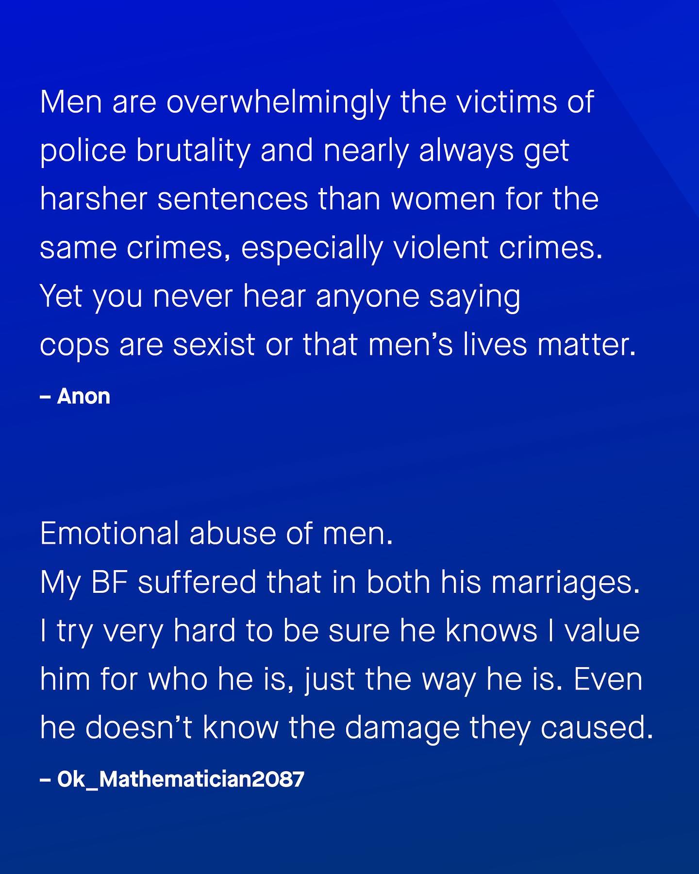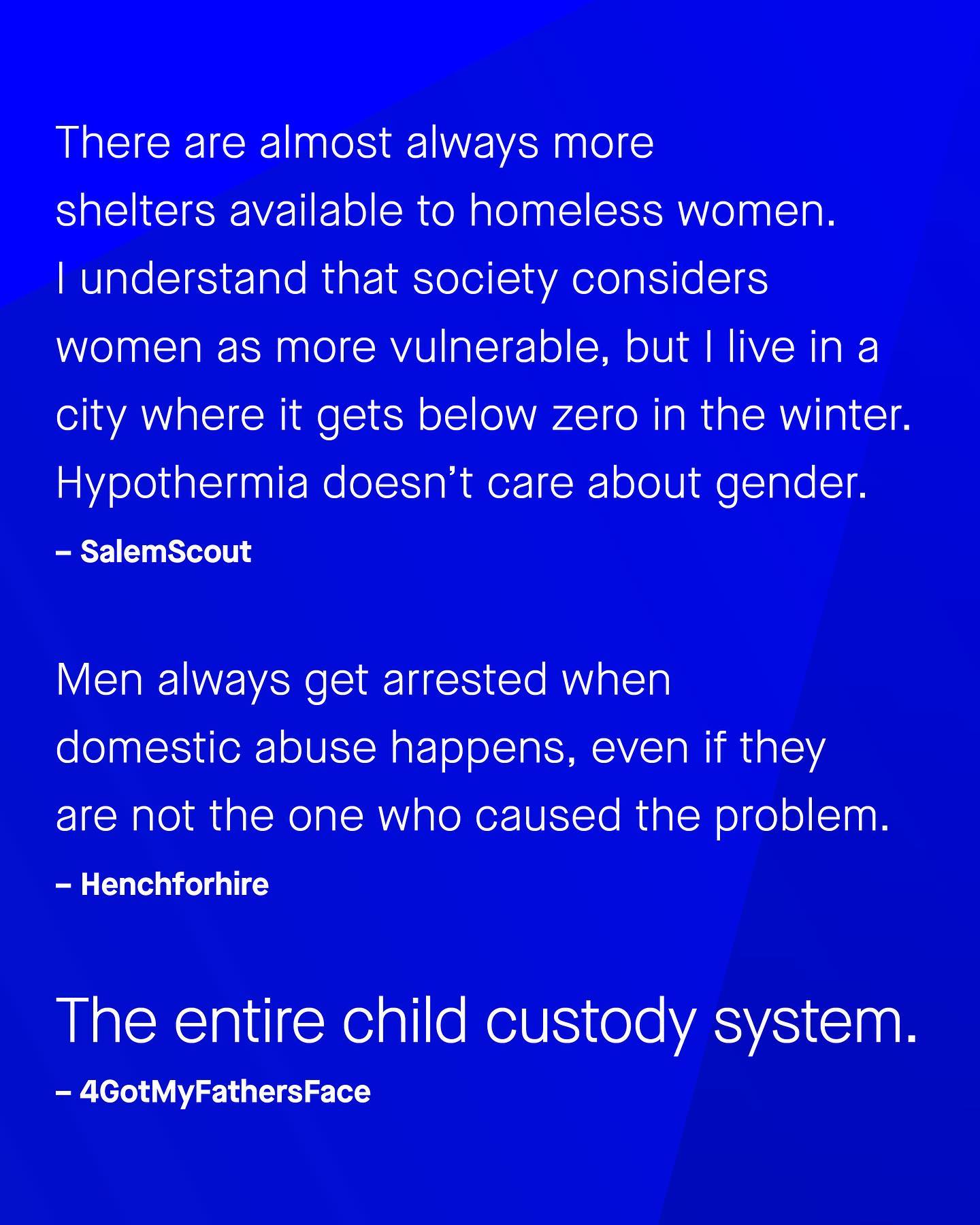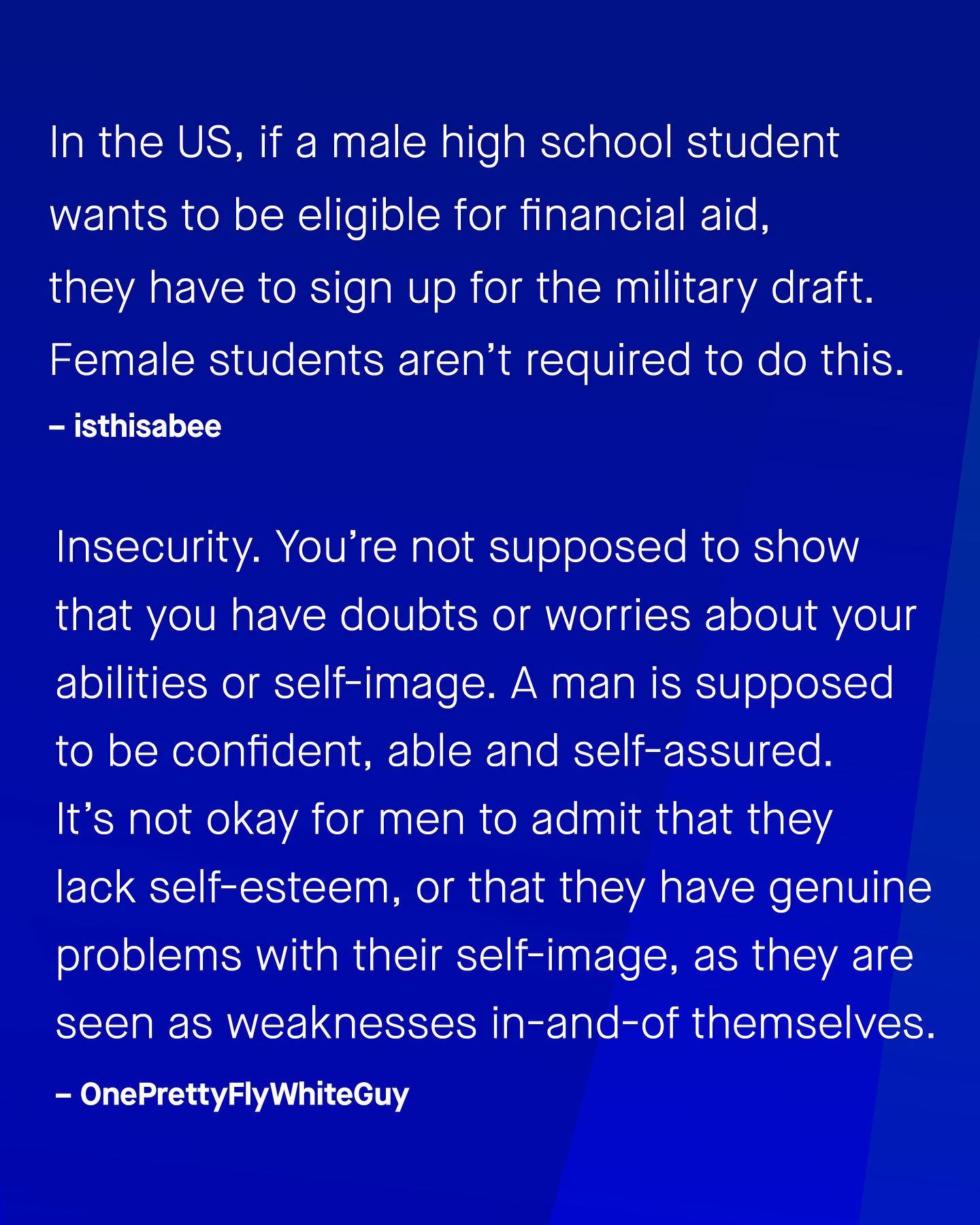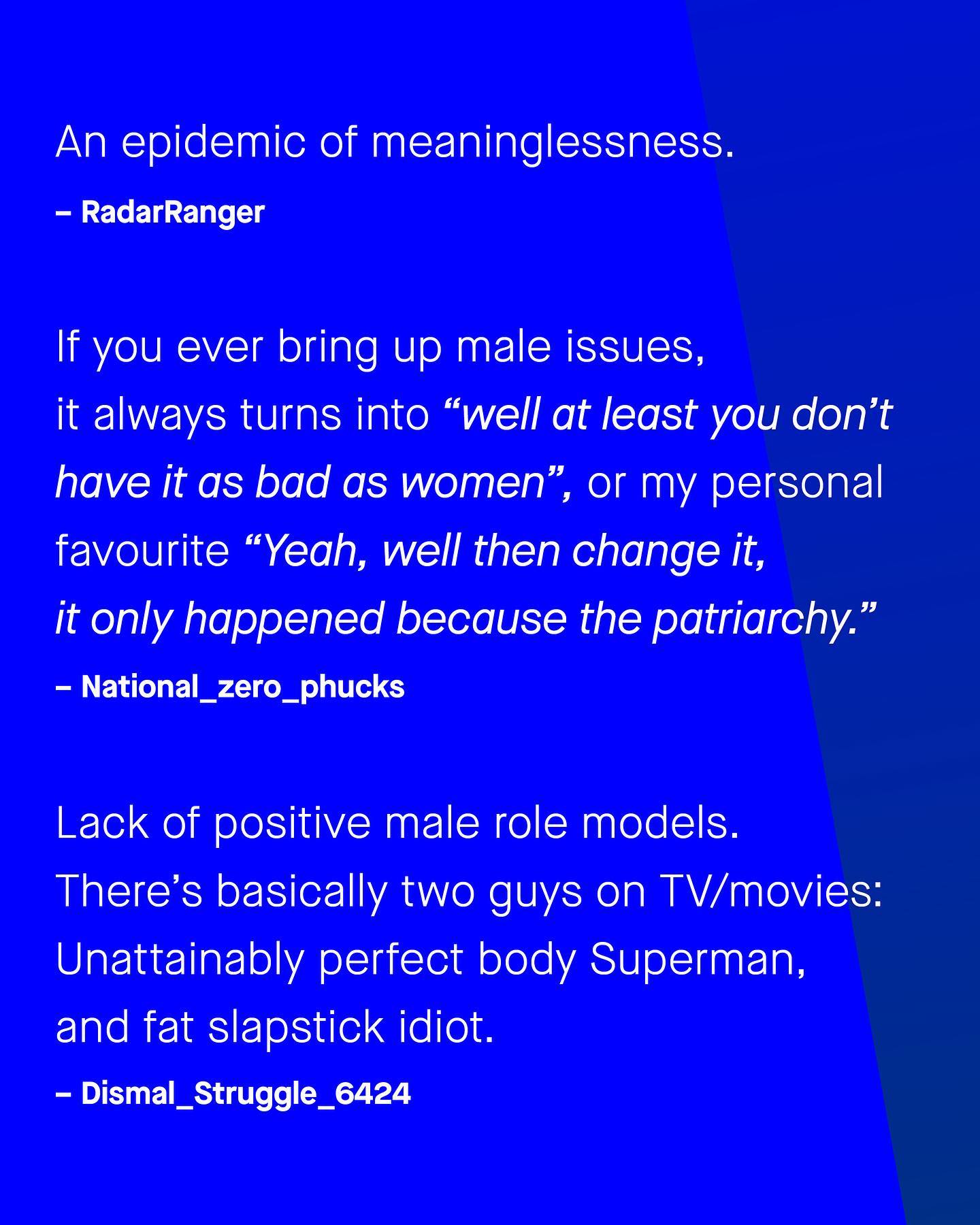 ‘Men’s issues don’t exist’ is usually something I find translates to ‘I don’t know what I am talking about, and haven’t bothered to educate myself’. The reality is, just because you don’t know something, doesn’t mean it isn’t there – meaning the lack of conversation around male disadvantages, is a self perpetuating problem. So to break the cycle, I want to ask: what are the men’s issues you think should be discussed more? What do you think? ~ #mensissues #mensmentalhealth #genderequality #mensmentalhealthawareness