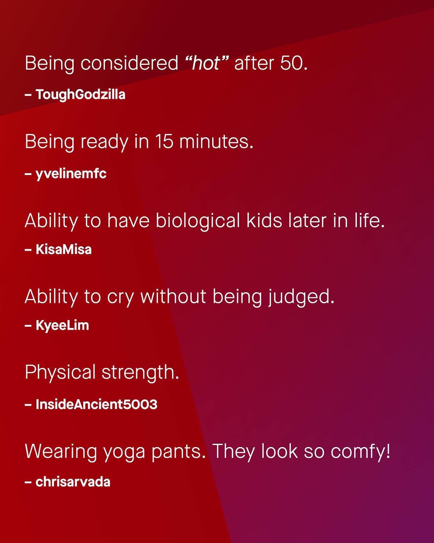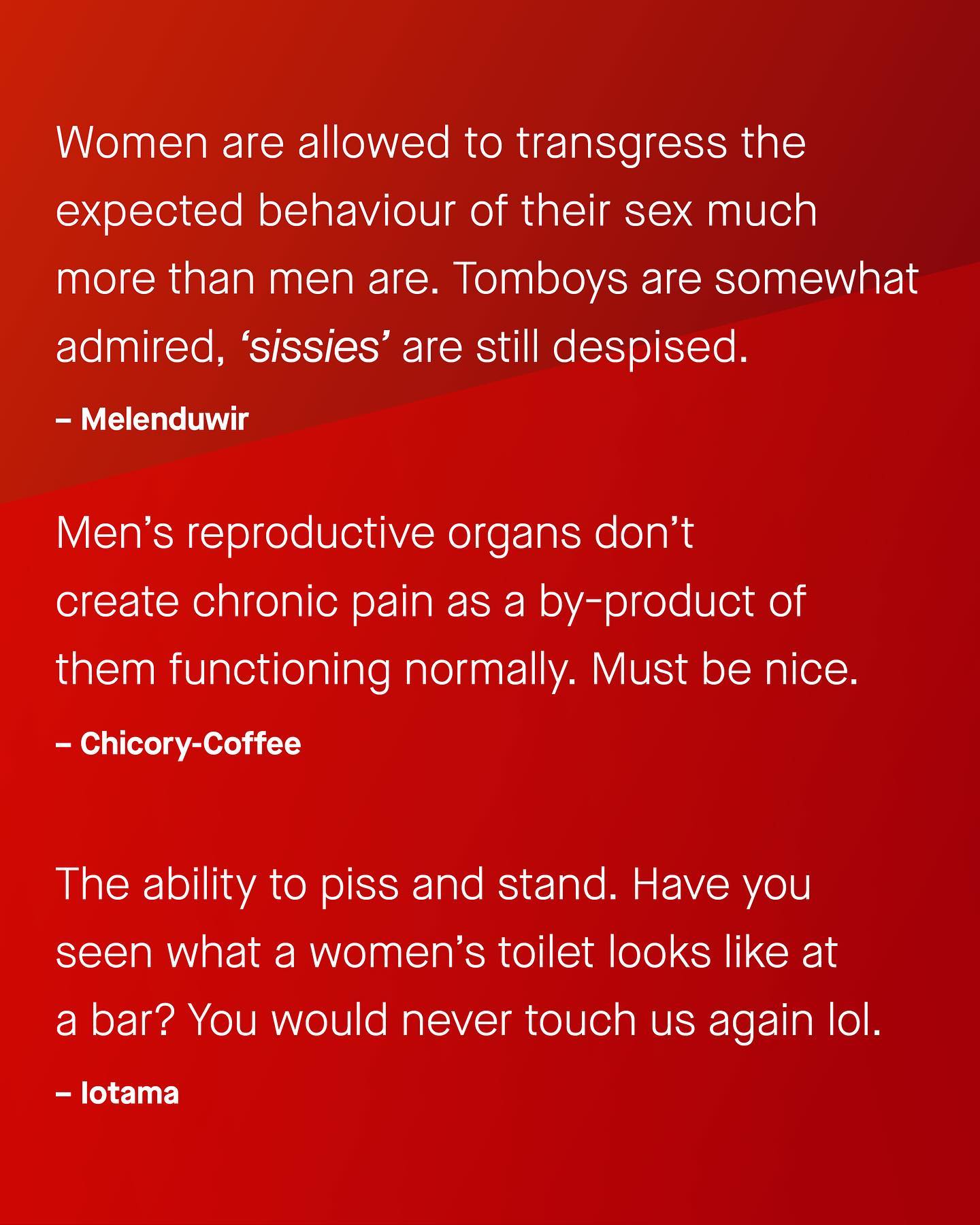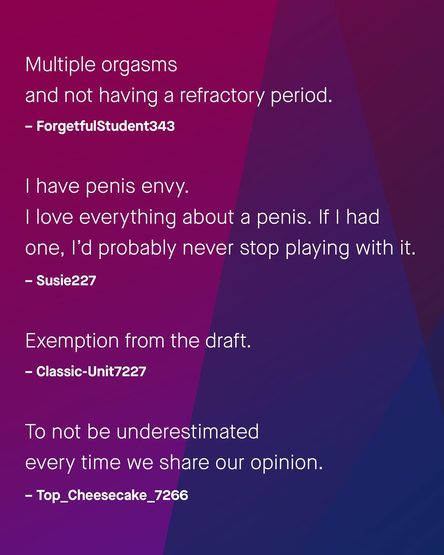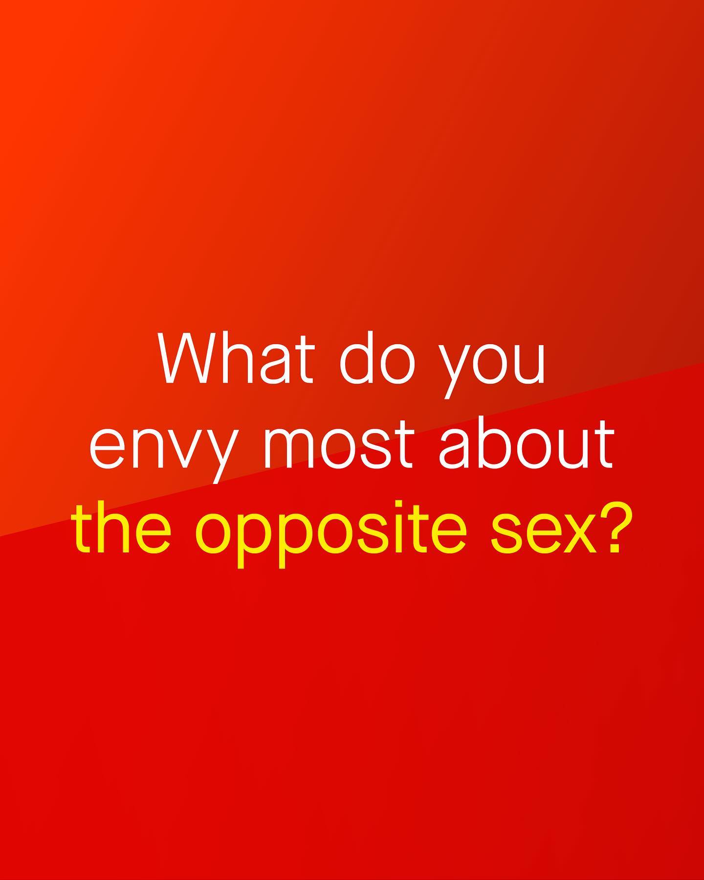The male and female lived experiences are often different, but equally difficult. It is only through an open and judgement free conversation that we can hope to understand those of the other, so can we have such a conversation right here? So tell me, what do you envy most about the opposite sex?