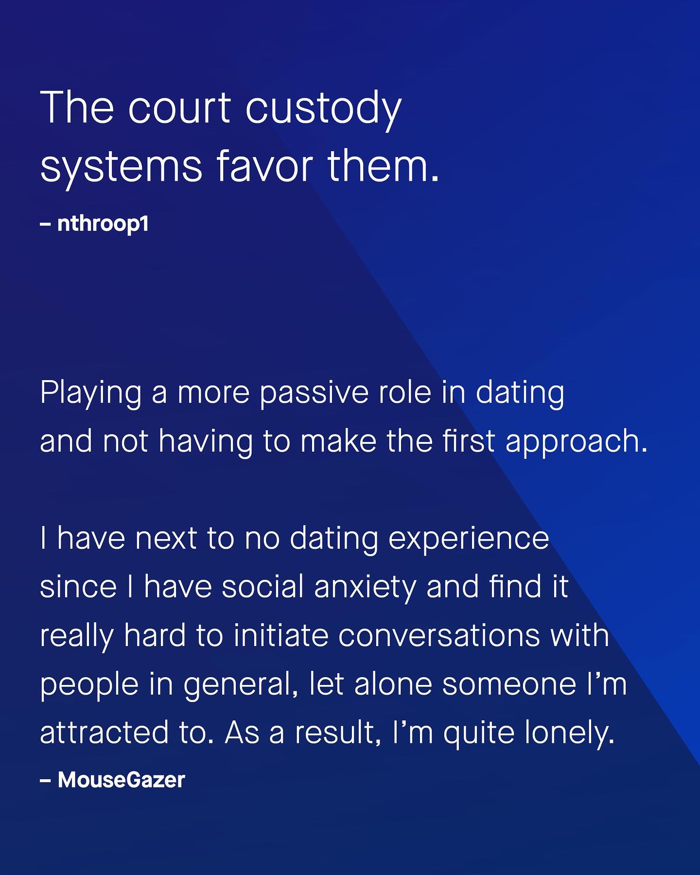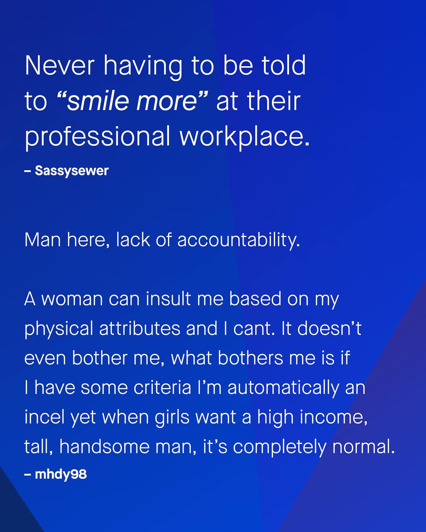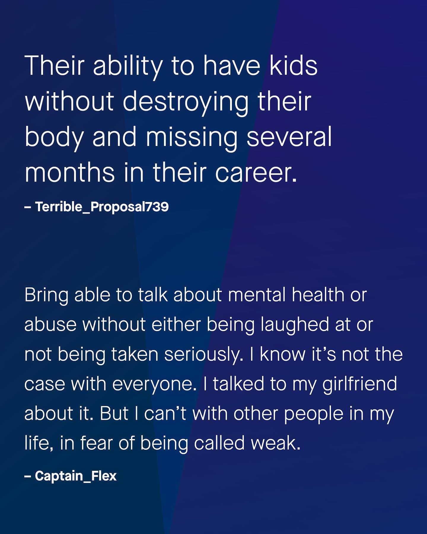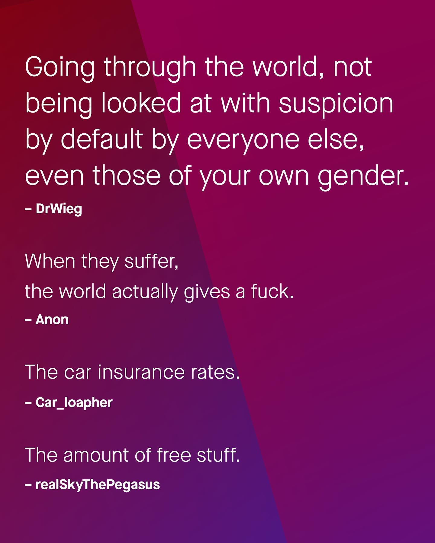 The male and female lived experiences are often different, but equally difficult. It is only through an open and judgement free conversation that we can hope to understand those of the other, so can we have such a conversation right here? So tell me, what do you envy most about the opposite sex?