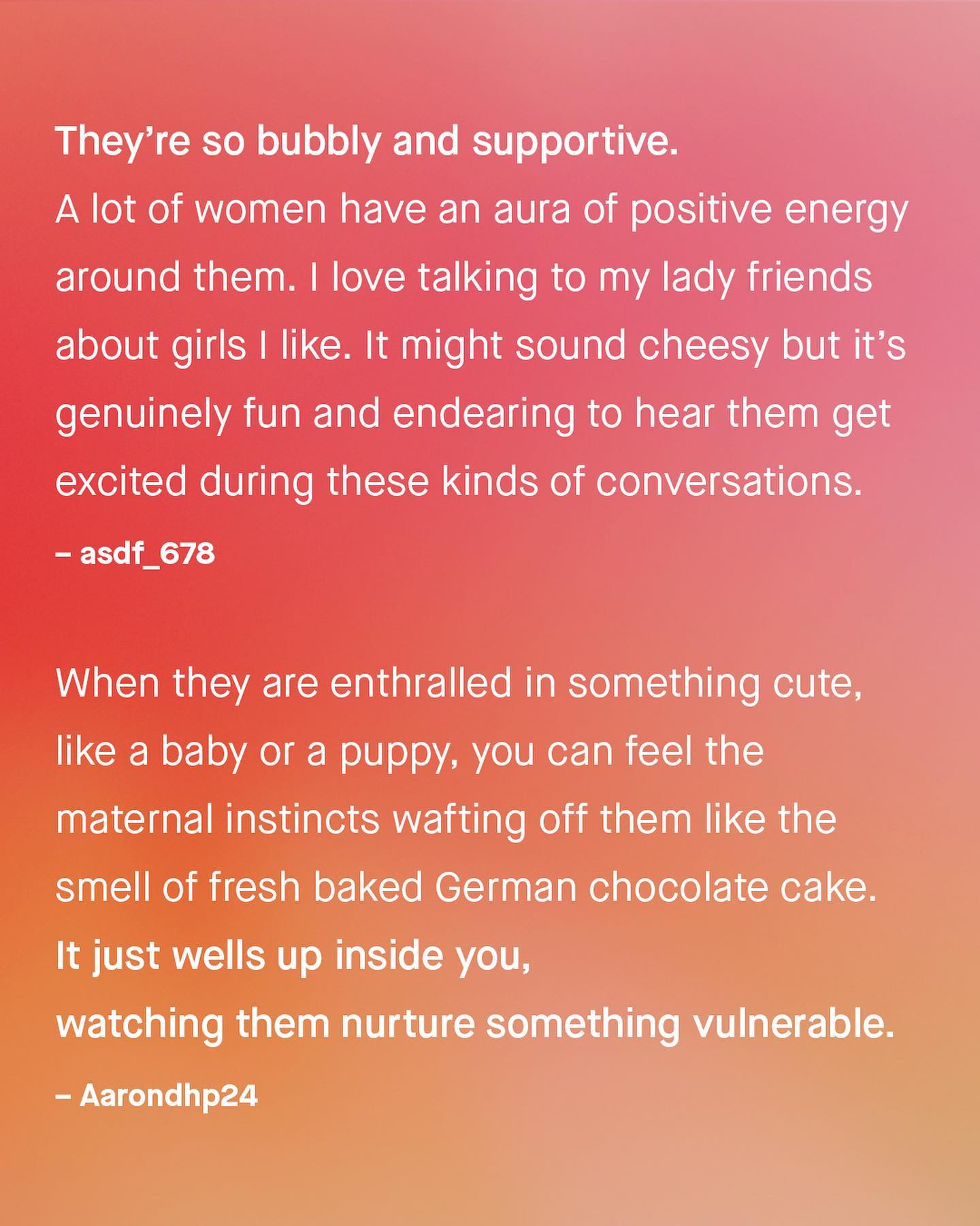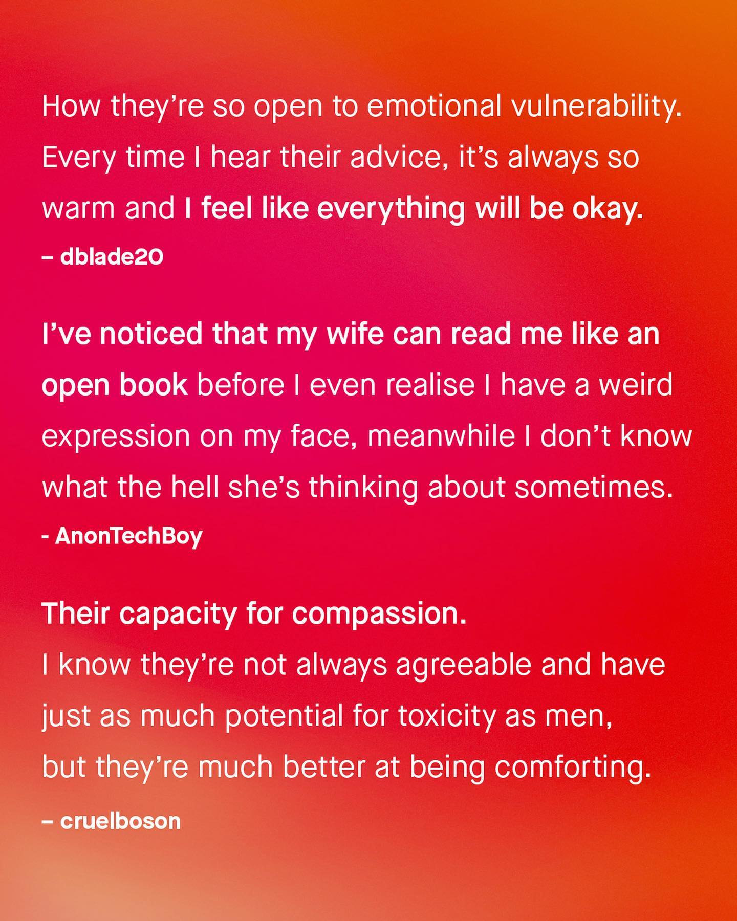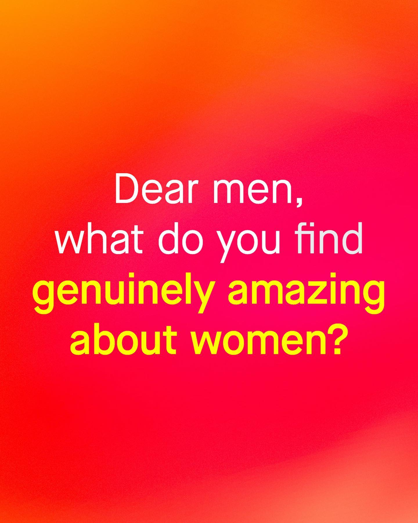 As controversial as it has now become to admit, women and men, in general, are not quite the same. I know, this account discusses many of the ways in which women can be different to men, and often in negative ways. But it goes without saying that women’s uniqueness, and their wonderful idiosyncrasies are an overwhelmingly good thing for society. Their contributions, original insights, and invaluable perspective, are a huge net positive, that we simply cannot do without. And not just to society, but to each of us as individuals. So to the guys I want to ask, what do you find genuinely amazing about women? ~ #men #women