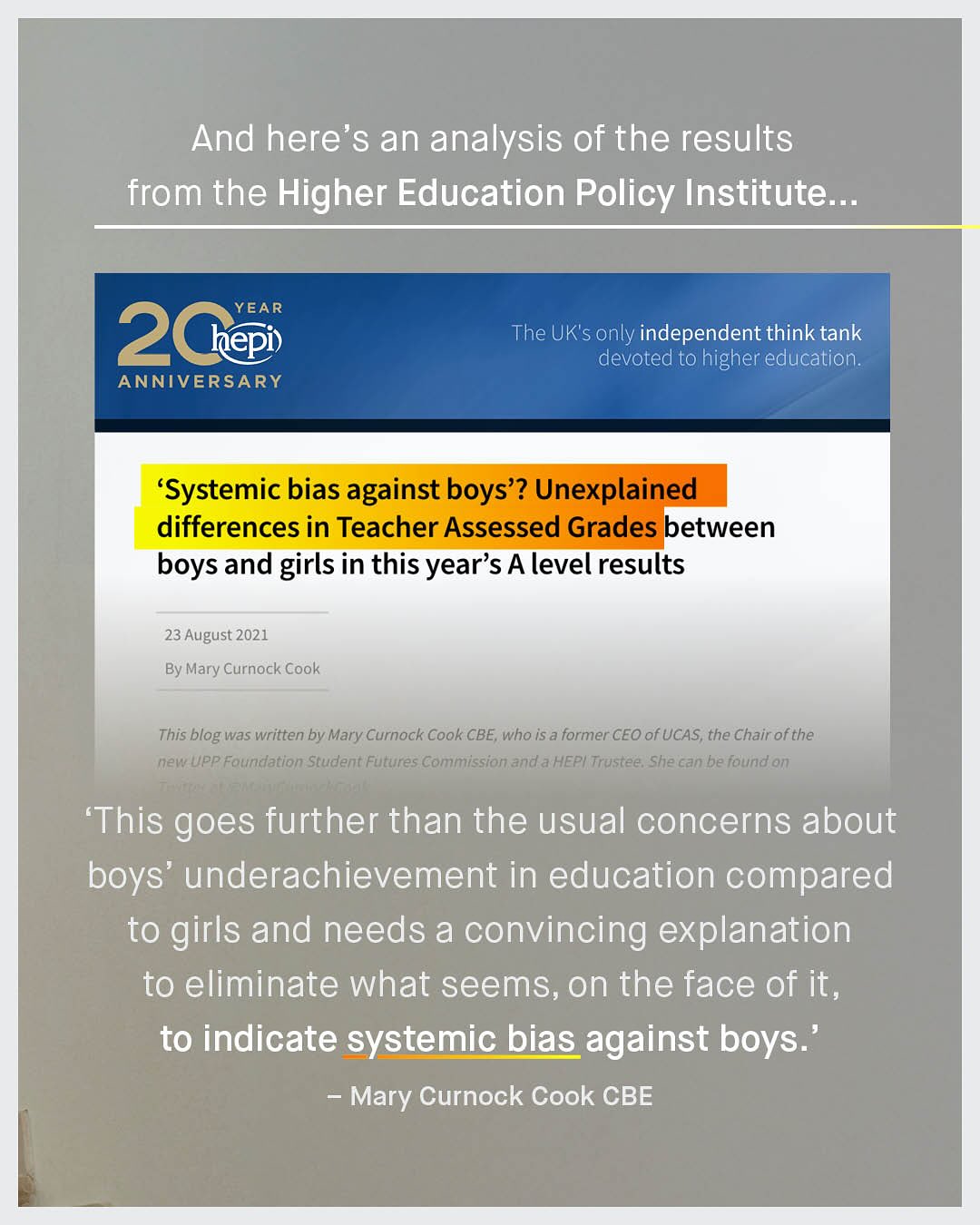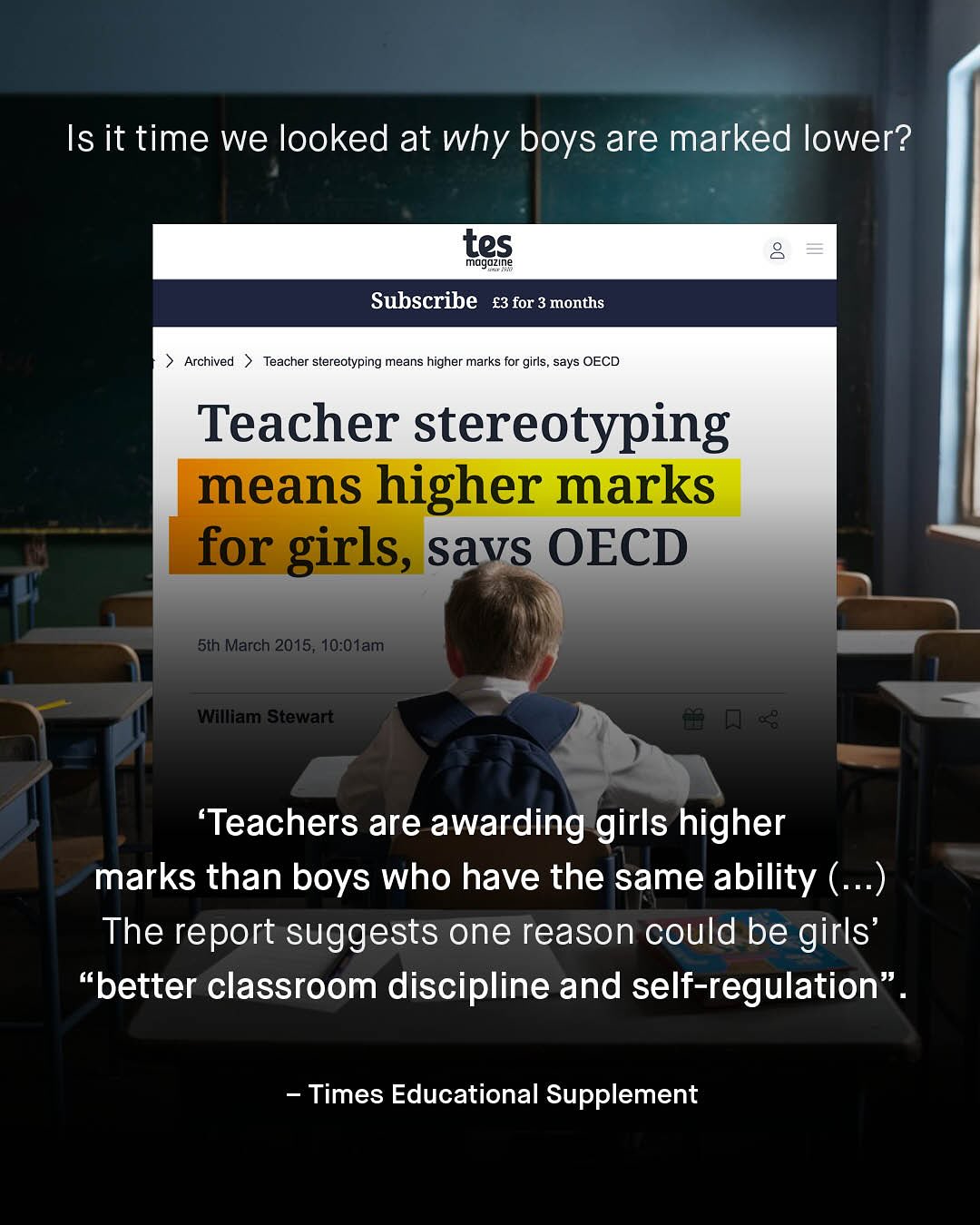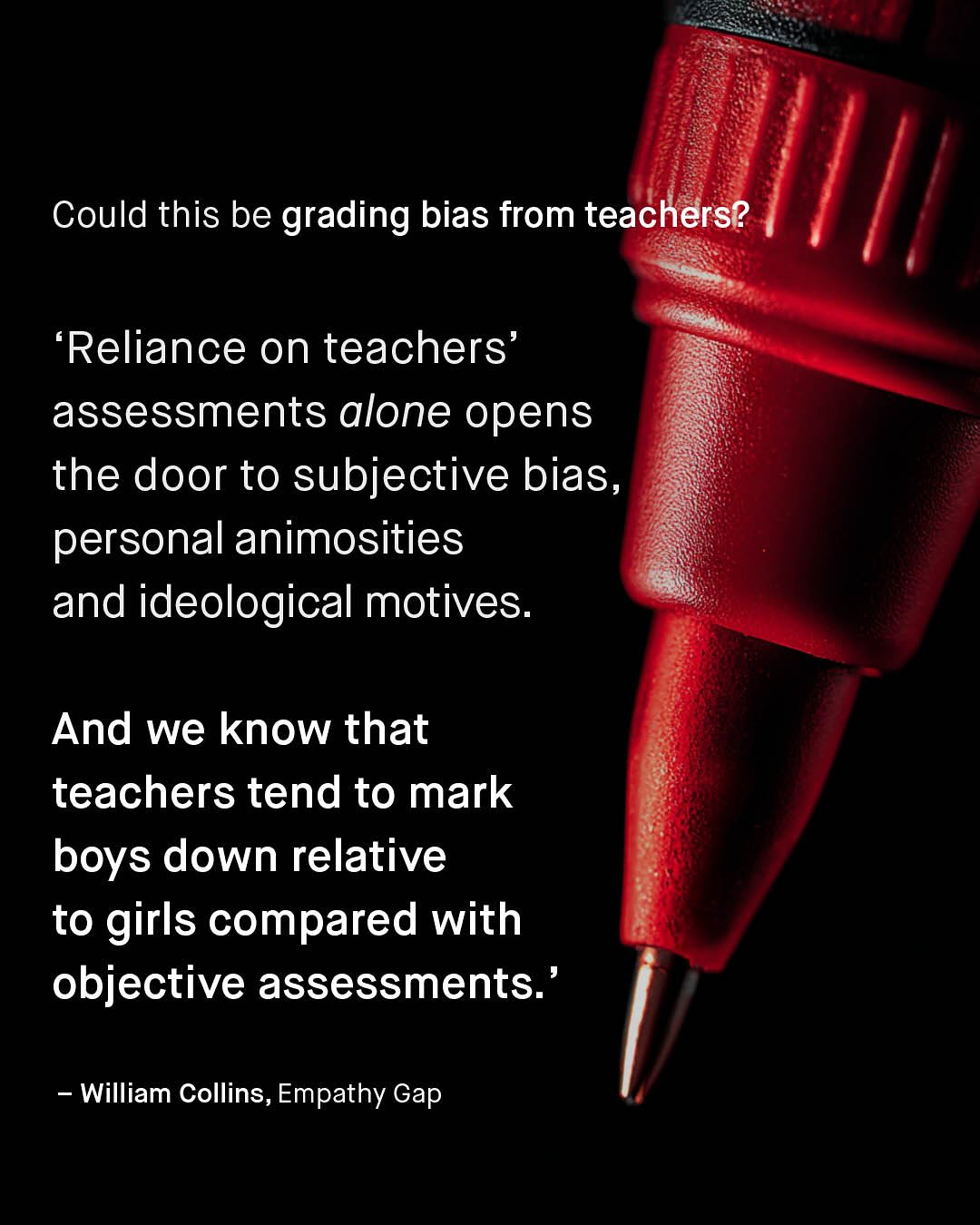 Something is quietly happening to boys in western education… they are failing. Failing across the board, at all levels, and for decades. And yet, despite the gap getting bigger and bigger, our knowledge and interest in understanding what is going on remains as apathetic as it always has; ignored by advocates, educationalists, policy makers and the media alike. Nobody is doing anything. And so, we are left with far more questions than answers. To quote Richard Reeves, arguably the world’s leading authority on men and boys: ‘World-class scholars have pored over the low rates of male college enrolment and completion, piling up data and running regressions. I have read these studies and spoken to many of the scholars. The short summary of their conclusions is: We don’t know.’” “We don’t know.” You have no idea how often I read that, or have to say it myself, and it is simply not good enough any more. However – One of the ideas that attempts to explain why boys are behind, is the controversial idea of teacher grading bias. It’s a phenomenon that reveals itself when you take boys and girls of equal intelligence, and look at how the grades change when it comes to teacher assessments. Yup. Boys and girls do equally well in tests, as an objective measure of raw intelligence, but when it comes to the classrooms, something changes. So what happened when that objective measure of exams (that mercifully keeps boys’ grades somewhat tethered to girls’), was taken away during COVID 19 lockdowns? Can such a once in a generation event be used to examine the phenomena of teacher bias? So, do we mark boys down, of the same cognitive ability? And is our school system rigged against them? What do you think? ~ Empathy Gap, William Collins A Level Data Hepi article Images by Andrej Lisakov, and Giulia Squillace and Karolina Grabowska #boys #parentsofinstagram #boymom #boydad