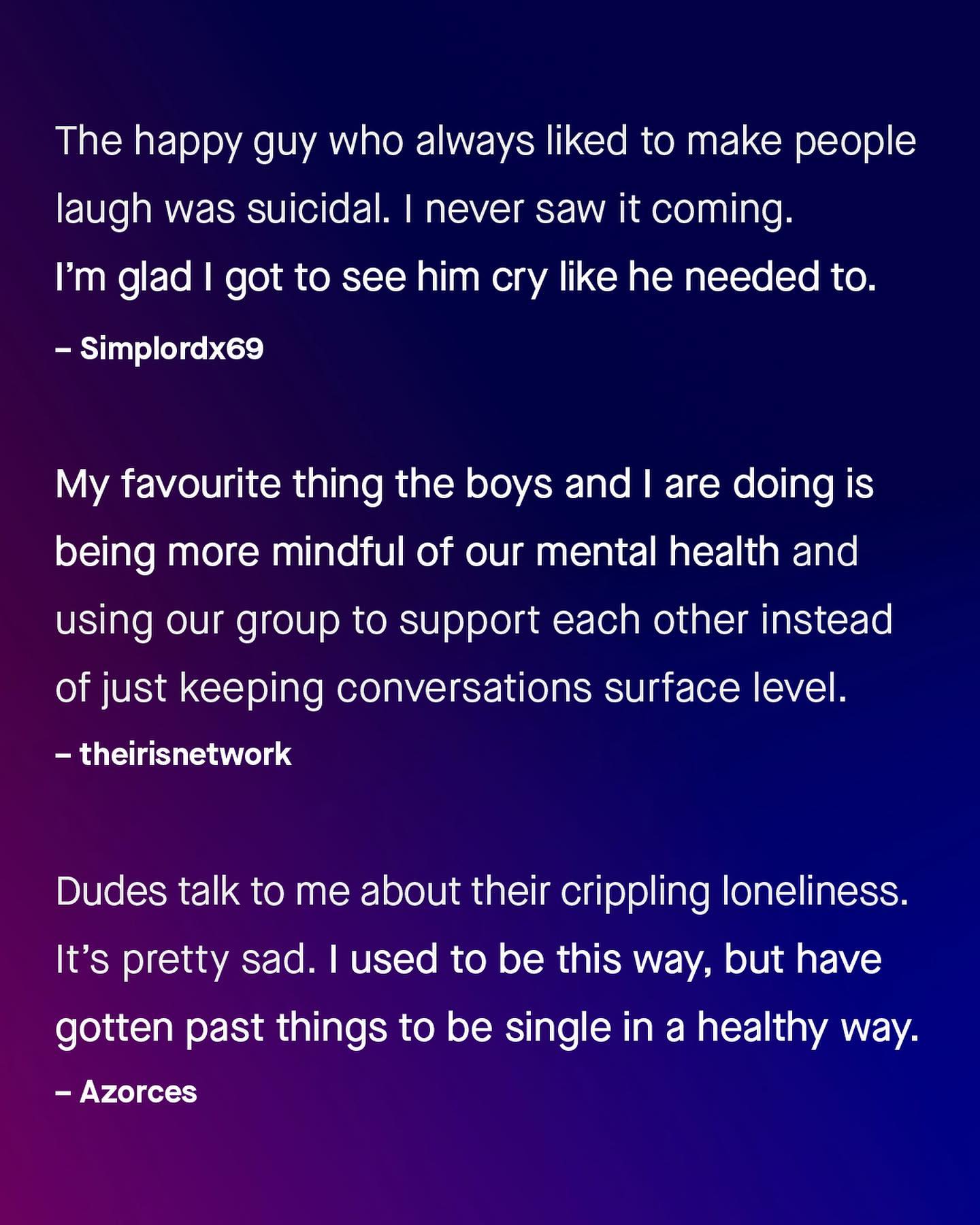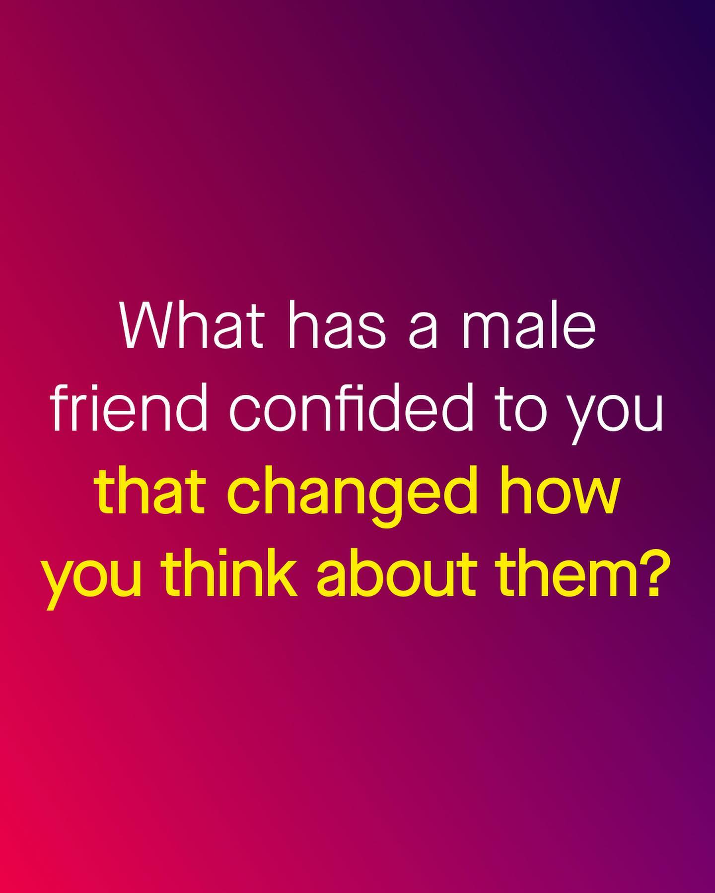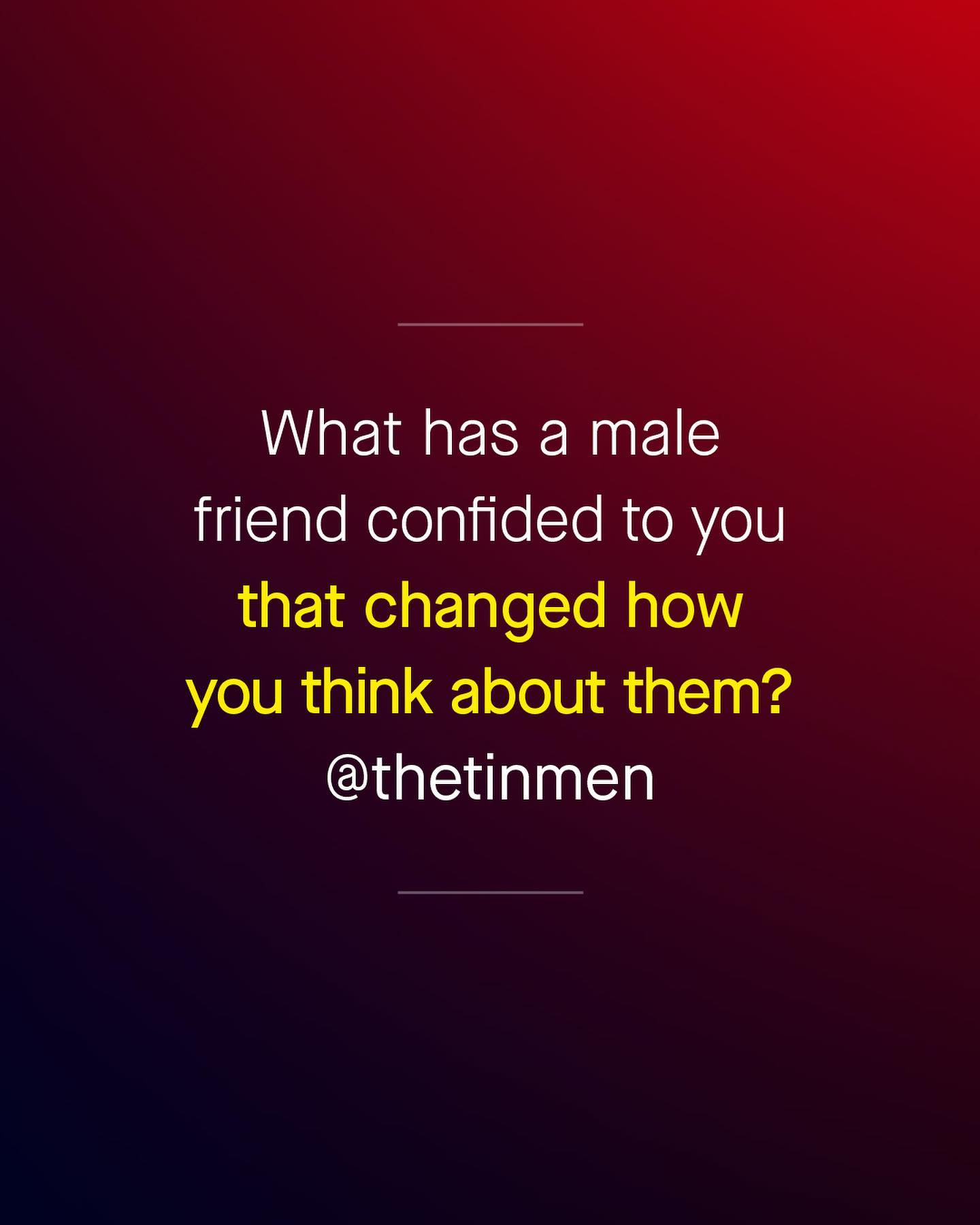 Not all men choose to express themselves so openly through words. Not all men can. Not all men want to. Whoever men are, however they choose to share things, if at all, their words can change the entire world. The can illuminate, for we can never know what men aren ’t telling us. They can change how people see them forever, or how people see themselves. So tell me, what has a man confided in you, that changed everything about them?