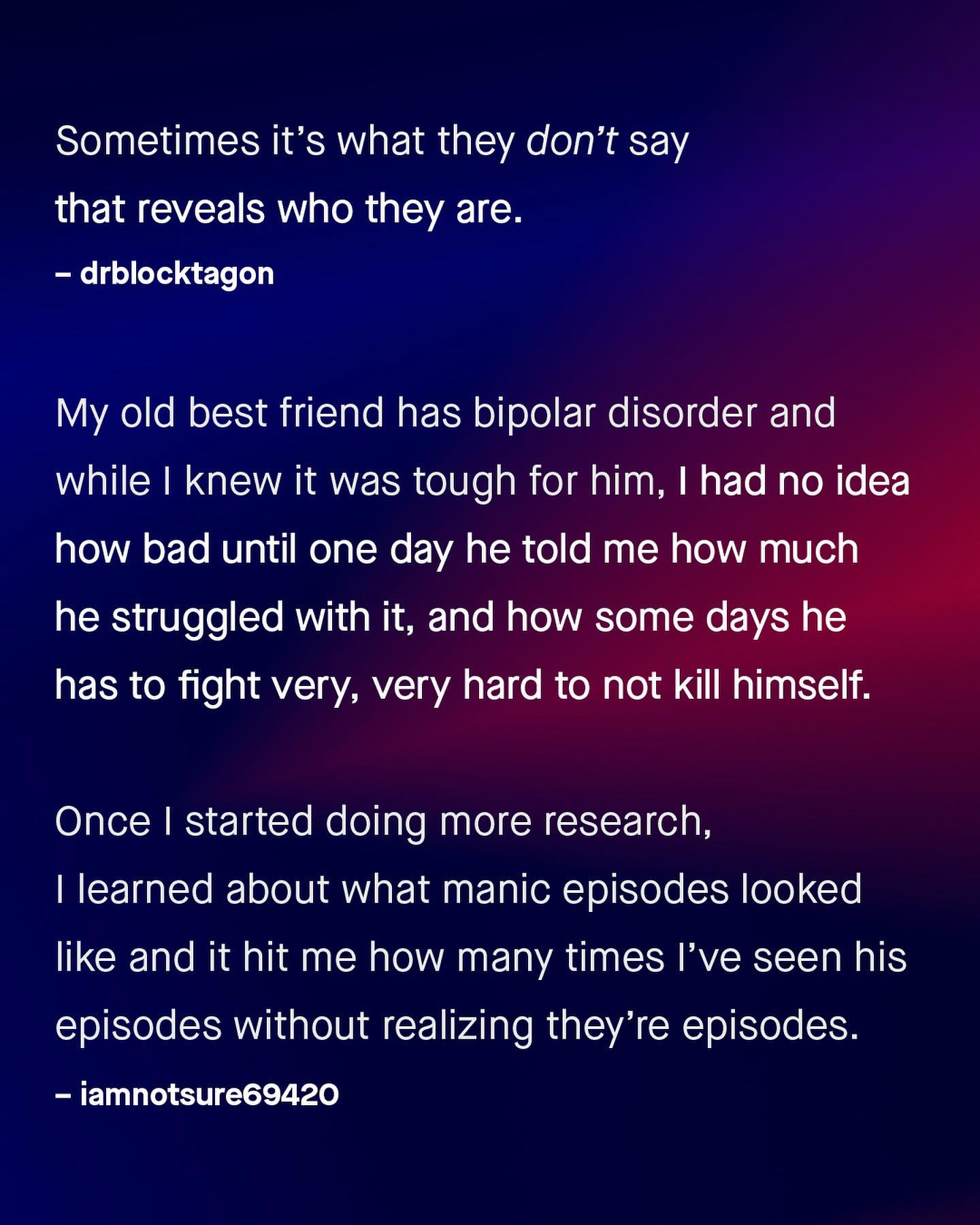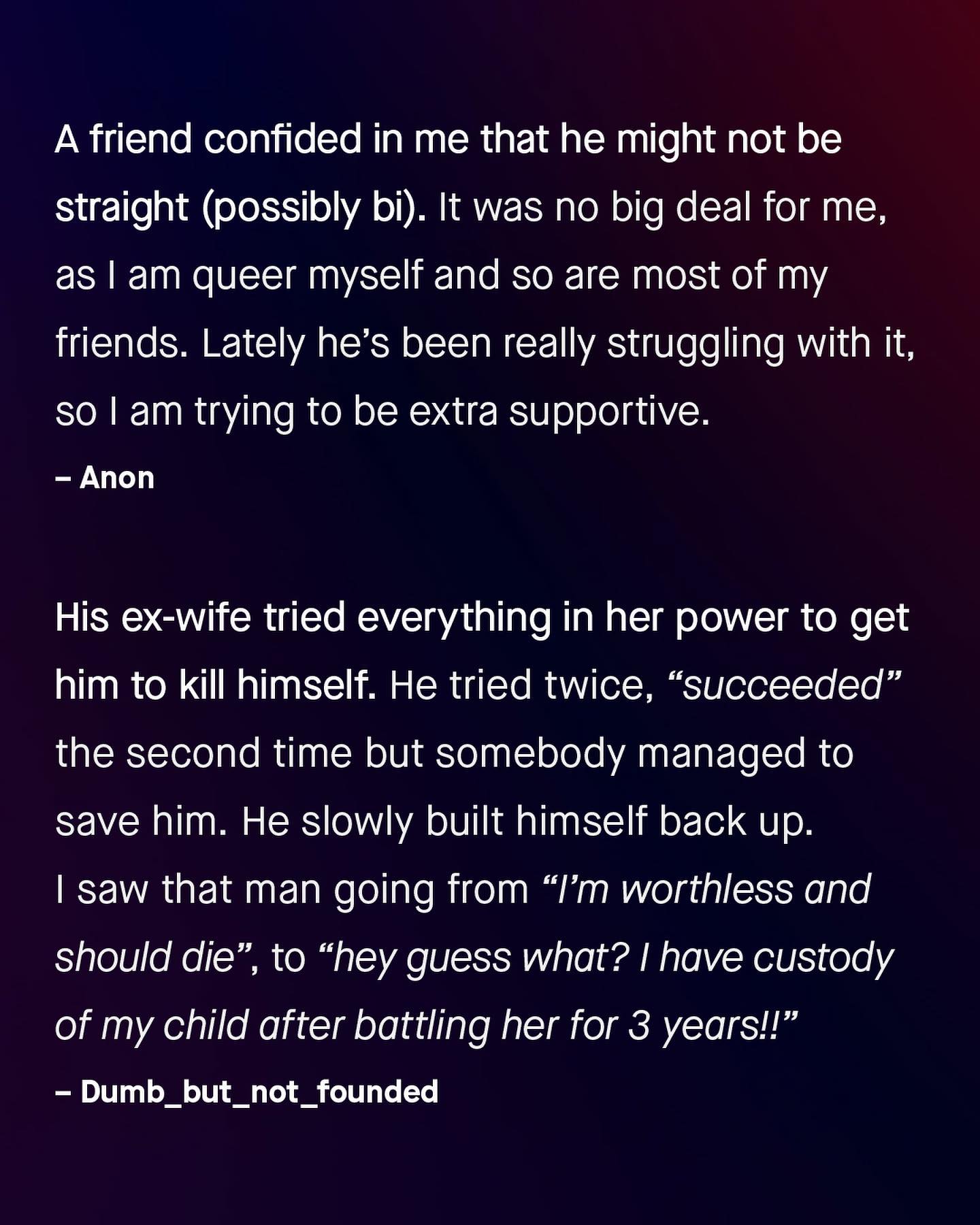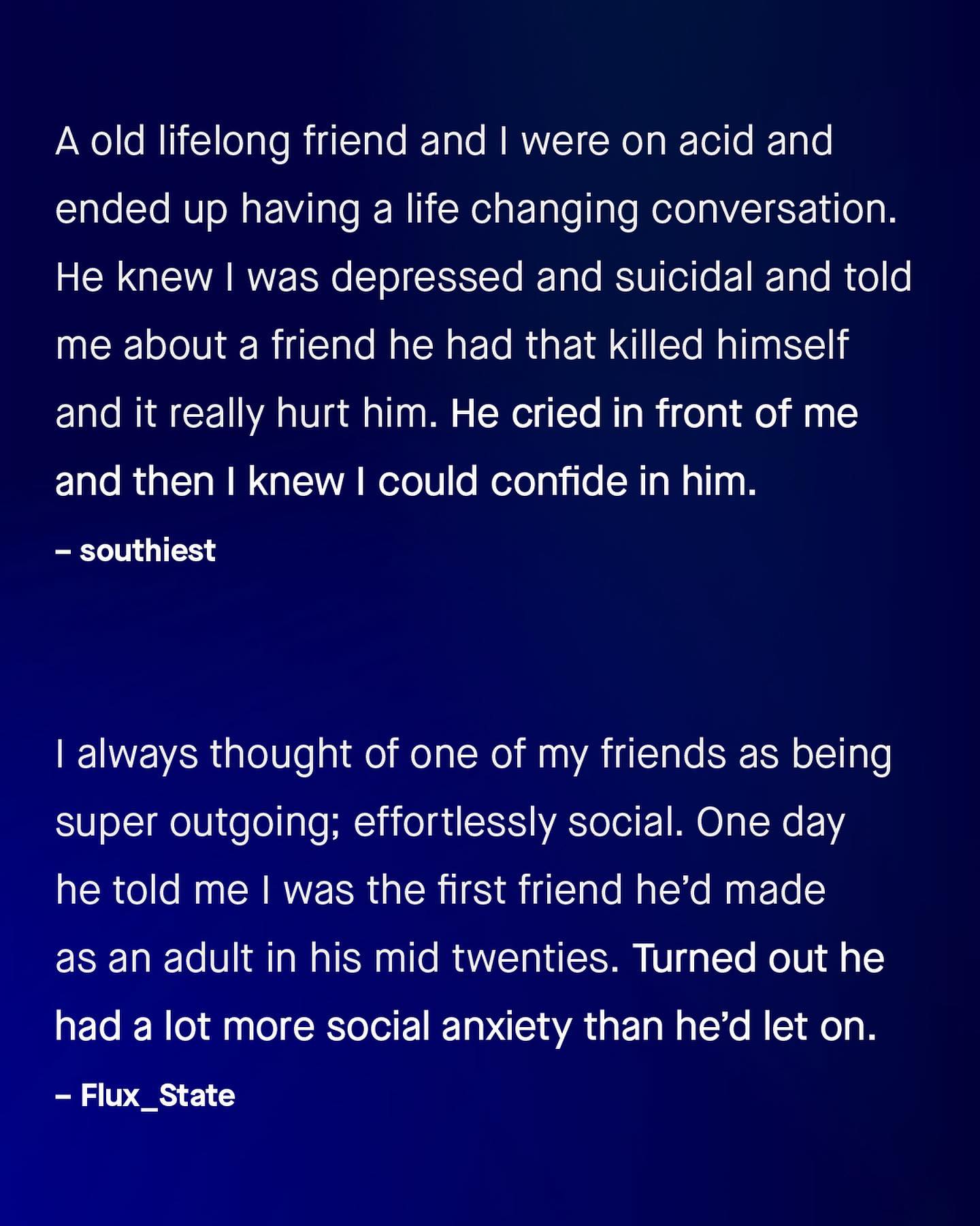 Not all men choose to express themselves so openly through words. Not all men can. Not all men want to. Whoever men are, however they choose to share things, if at all, their words can change the entire world. The can illuminate, for we can never know what men aren ’t telling us. They can change how people see them forever, or how people see themselves. So tell me, what has a man confided in you, that changed everything about them?