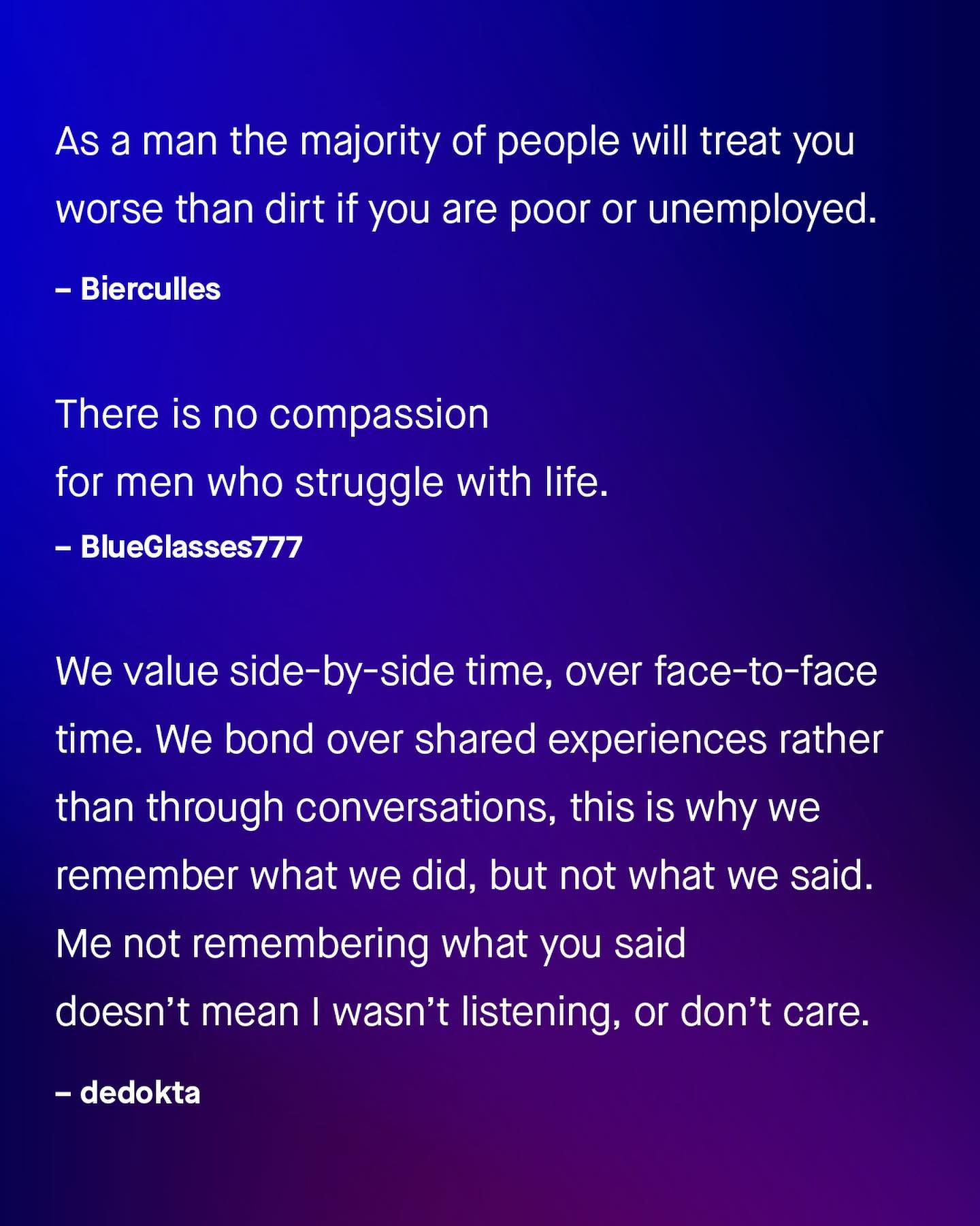There’s only so much change that can happen with spreadsheets, diagrams, pie charts and research. Sometimes the biggest impact comes from reading the words, and hearing the experiences of others – so with that, I want to ask the guys, what struggles do you face, that you don’t think women understand? #mensmentalhealth #mensissues #mensmentalhealthawareness