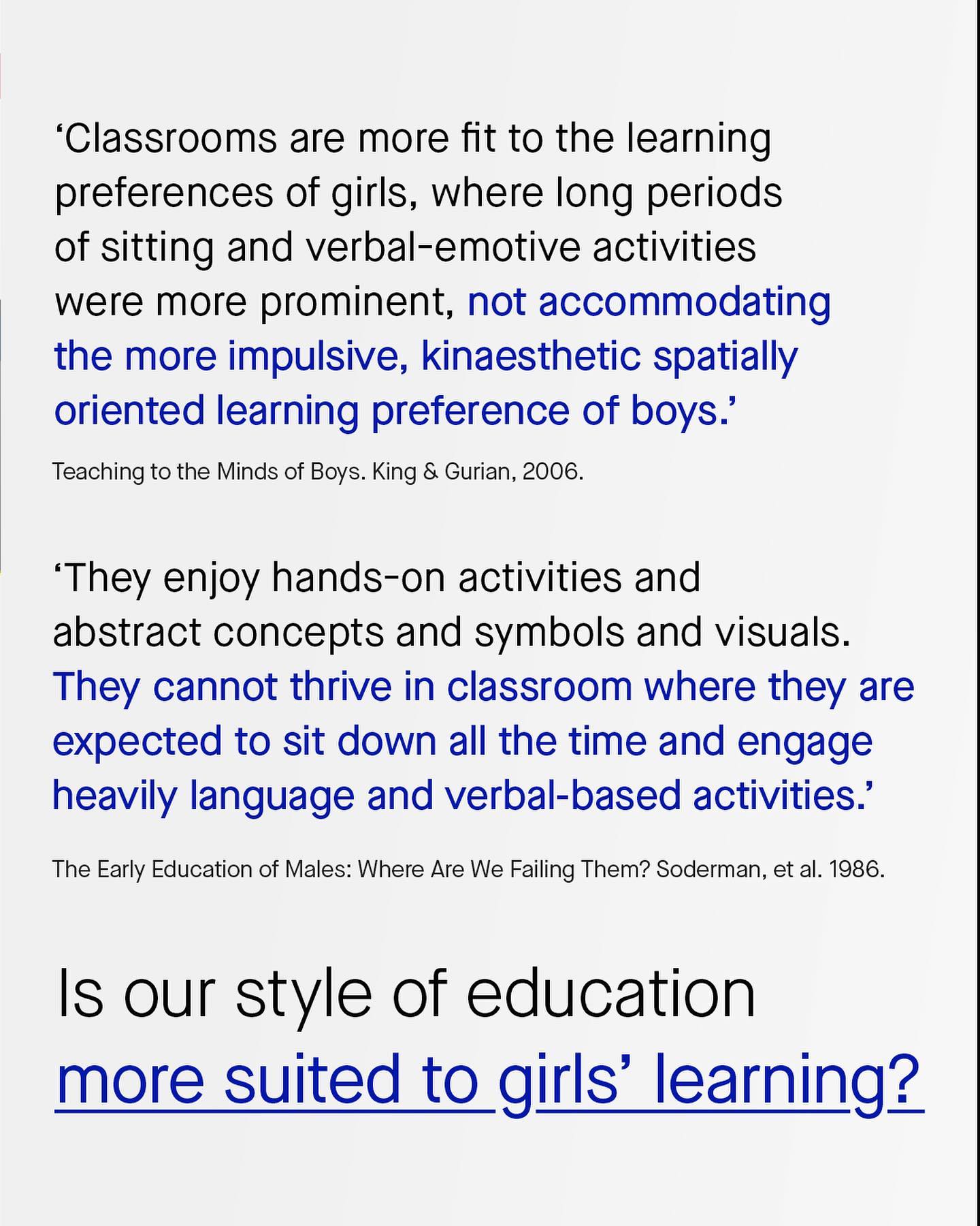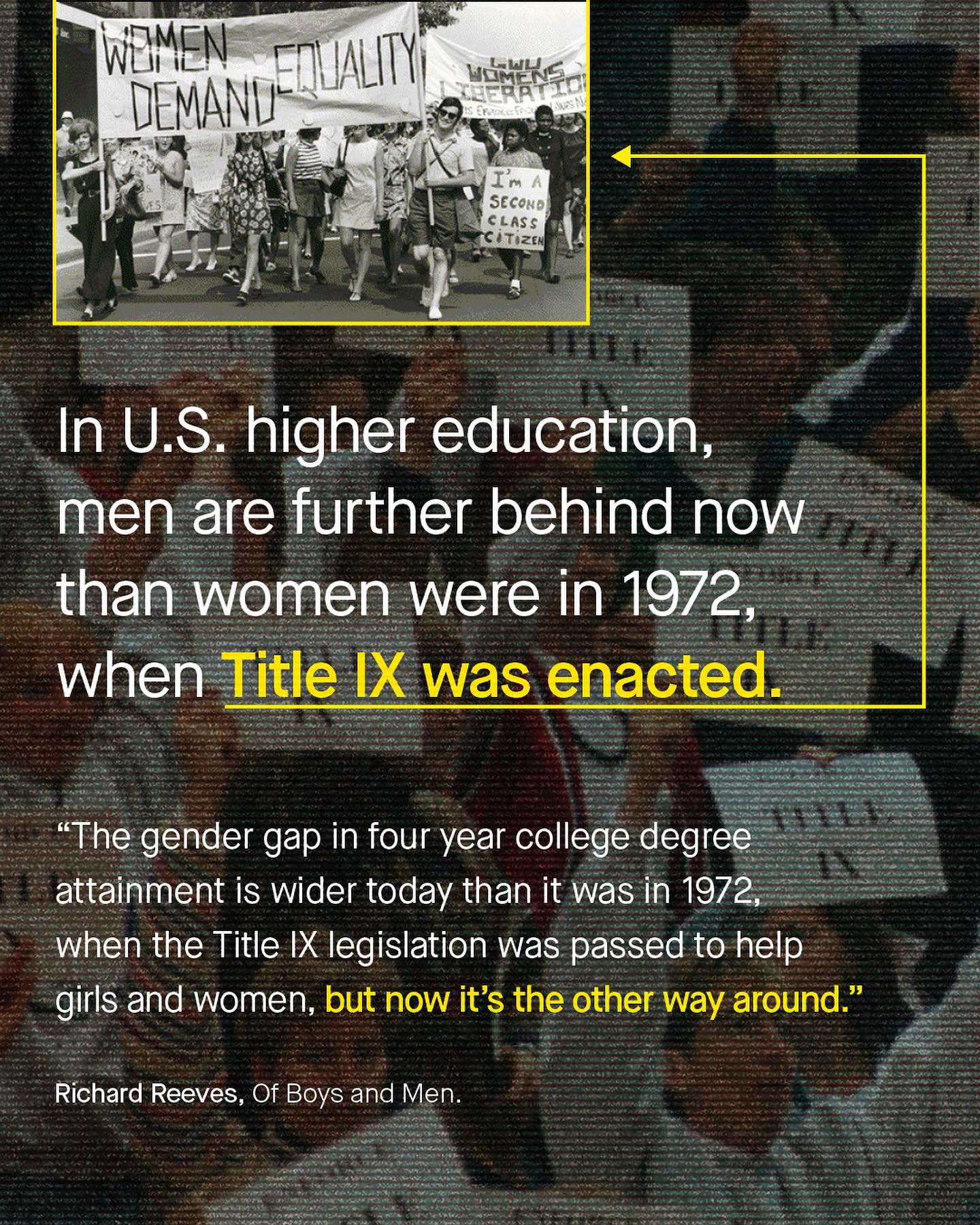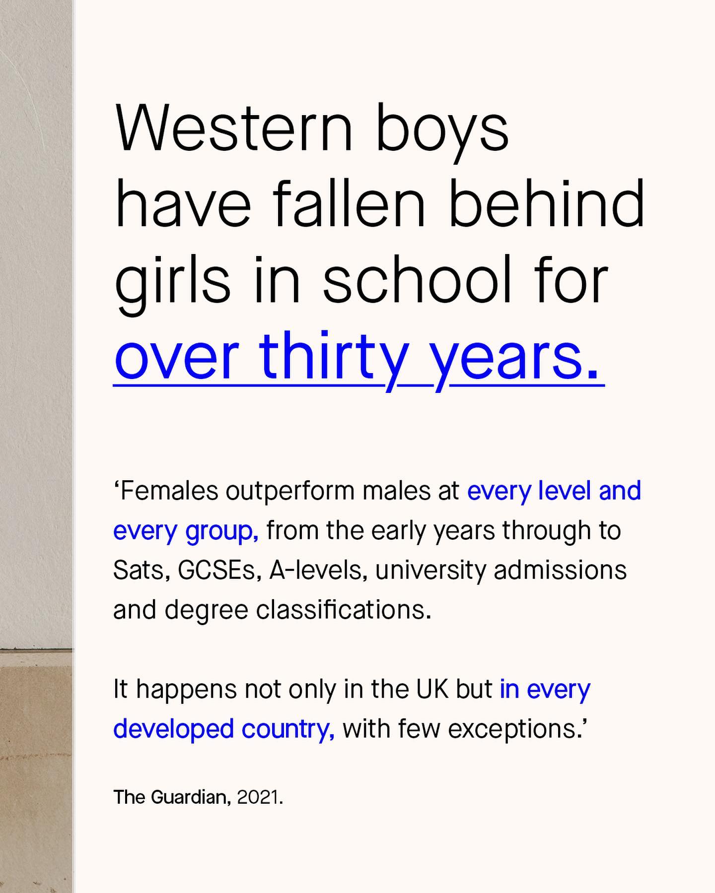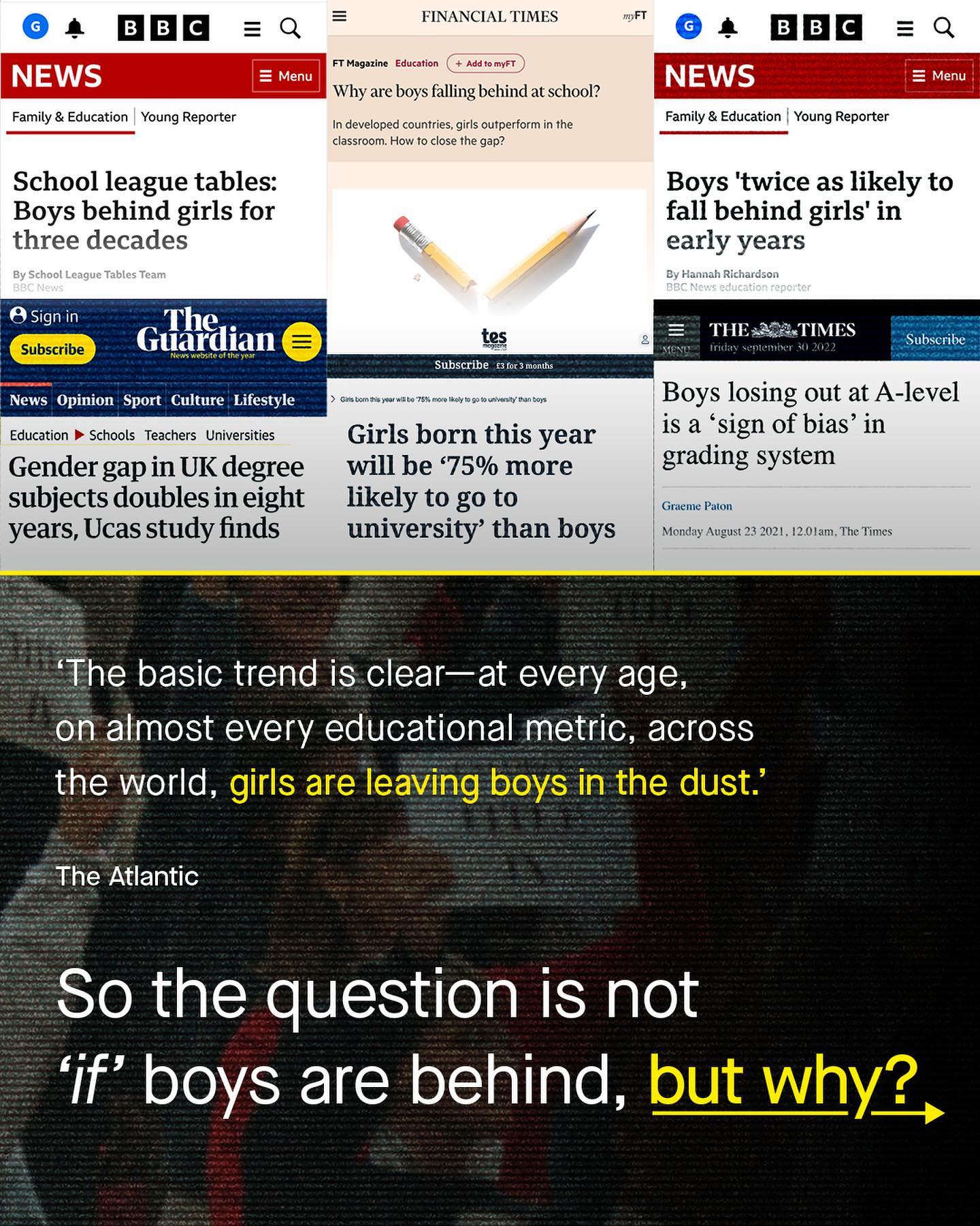 It’s a fact - boys are behind in Western education; at every level, every age group, and in virtually all developed countries. There’s no denying it and there’s no ignoring it. But what we don’t know for sure, is why? What has happened over the last three decades to see boys slip silently further and further behind our girls? Is it teacher bias? Is it the grading system? Is it boys delayed cognitive development? Do we problematise boys’ behaviour? What about gendered scholarships? Or perhaps the structure of the educational system itself is flawed? The point is, we don’t know for sure - these are only ideas. Nobody really knows, because nobody has cared to ask. And why not? America already has a National Coalition for Women and Girls in Education to ‘improve their educational opportunities’, so why is there nothing for our men and boys? Is anyone going to ask these uncomfortable counter-narrative questions, or challenge popular misconceptions? And how far do our boys have to fall behind, before we do something about it? ~ Sources The Difference between Girls and Boys Learning Teaching to the minds of boys The Early Education of Males: Where Are We Failing Them? The Plight of the Male Teacher: An Interdisciplinary and Multileveled Theoretical Framework for Researching a Shortage of Male Teachers Redshirting the Boys, The Atlantic OECD Teacher Bias Study Images by Dan Cristan Padure, Yustinus Tjiuwanda and Joshua Hoehne from Unsplash