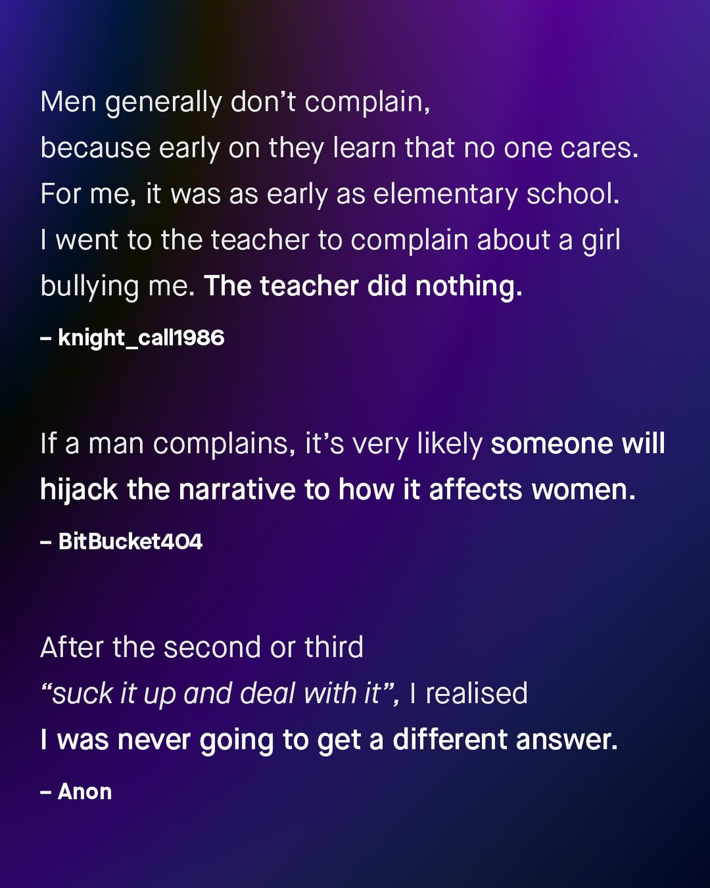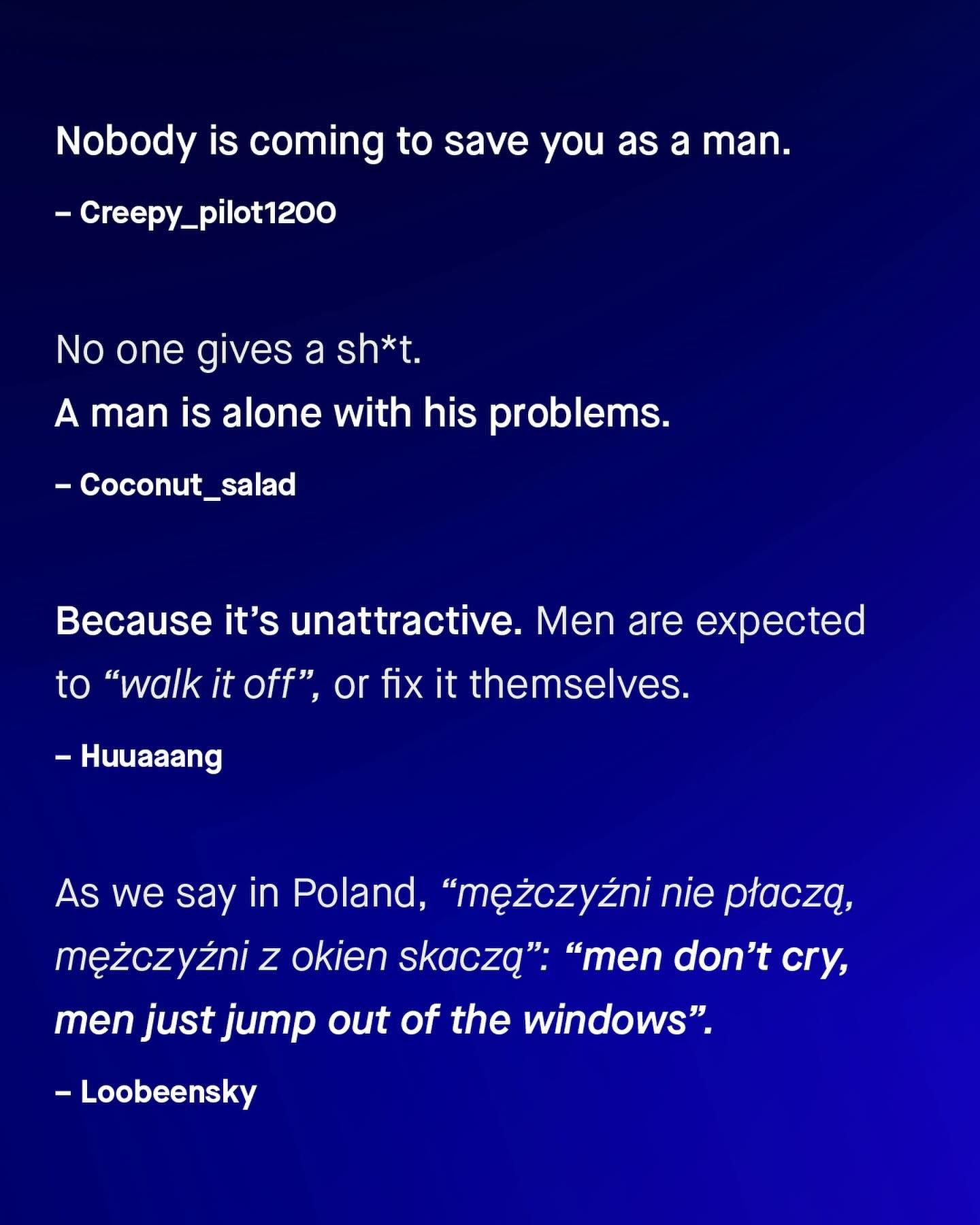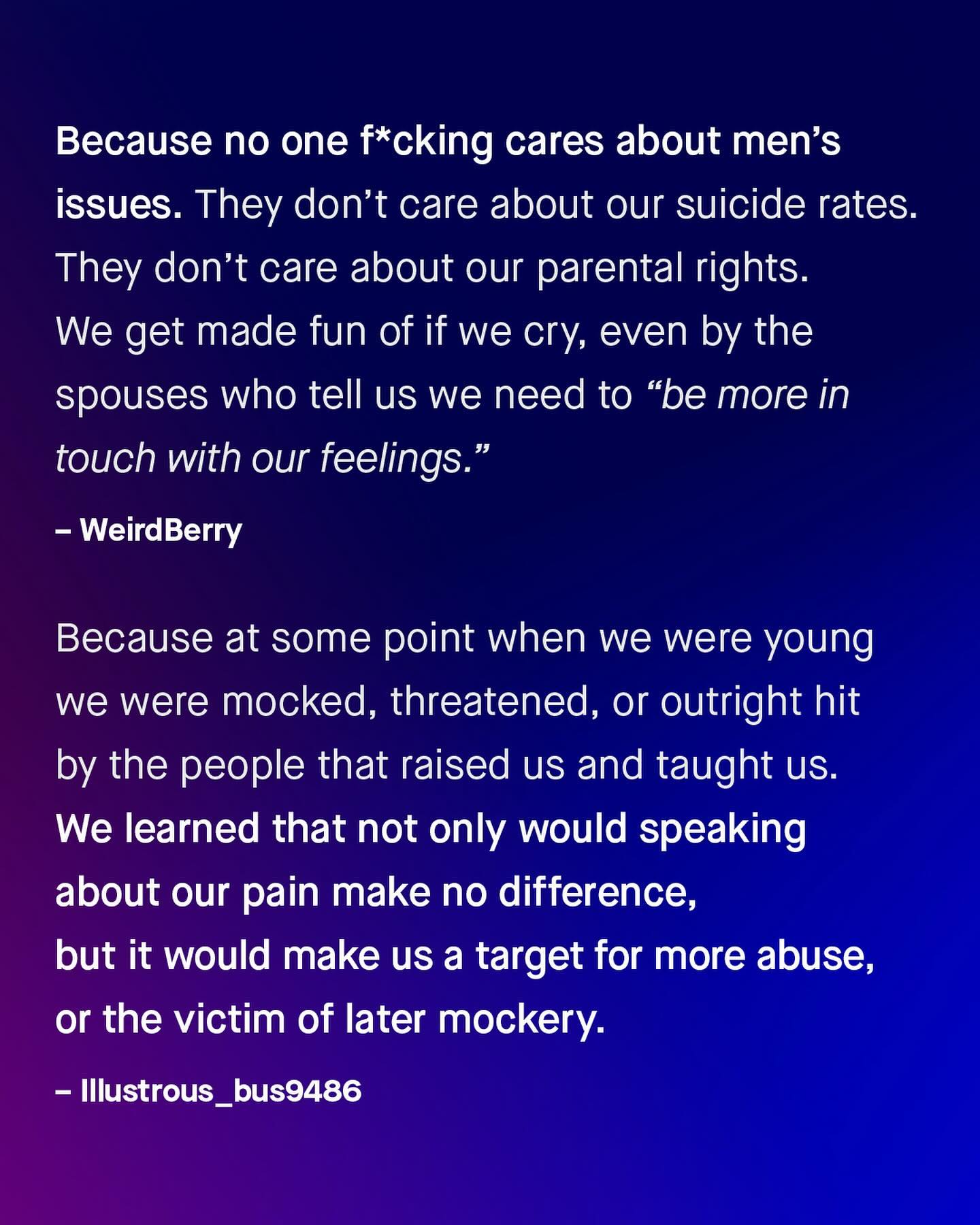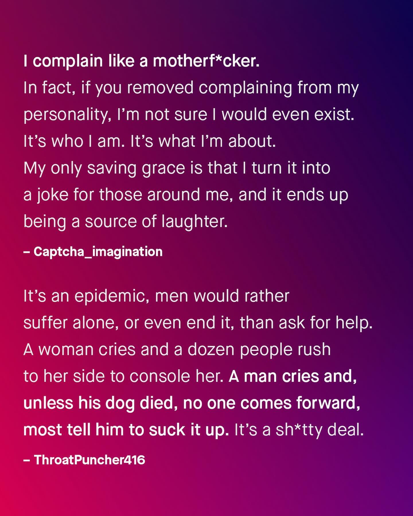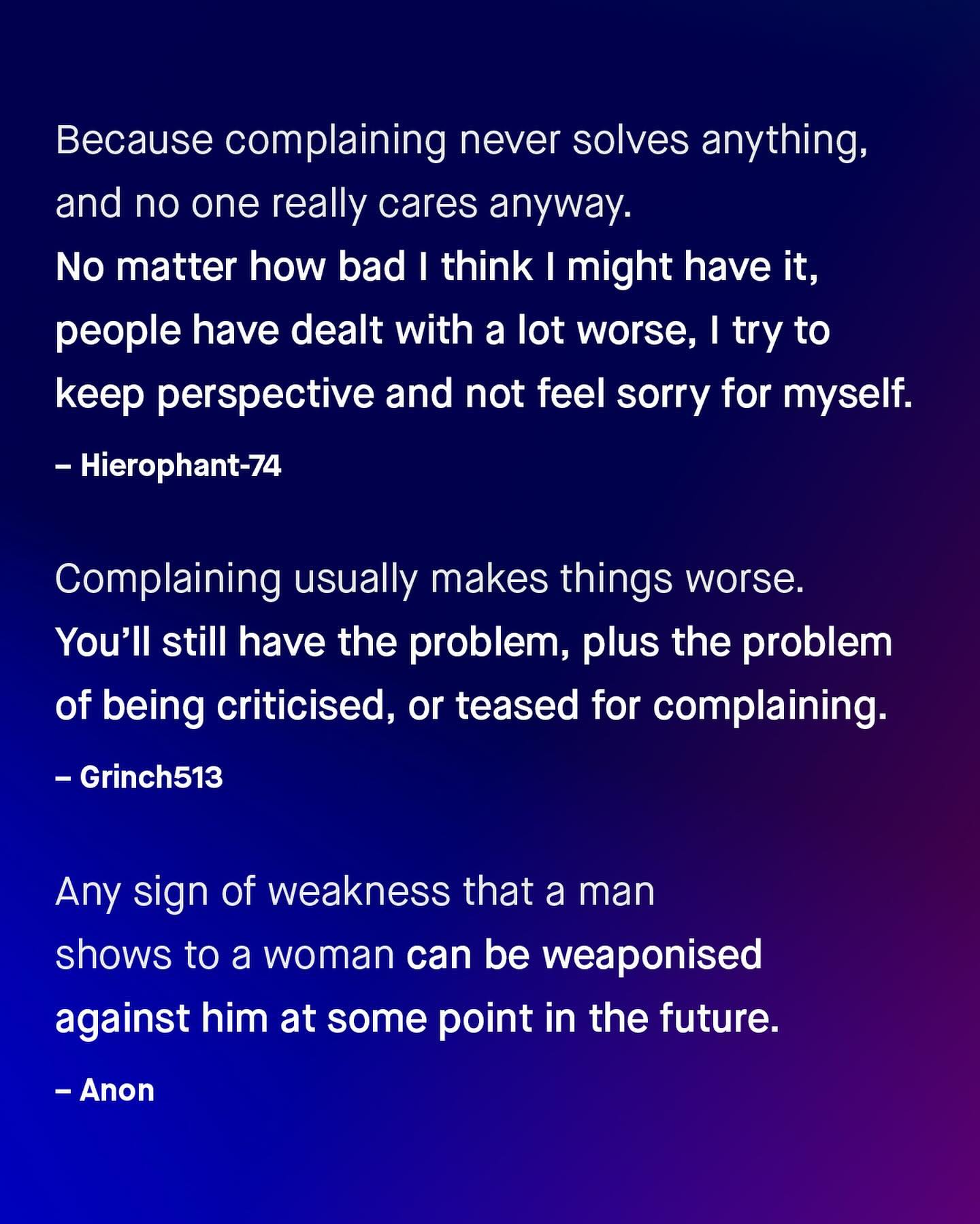 I know. There are plenty of annoying men who whine and complain endlessly, many about trivial or nonsensical things – and I have a mountain of DMs to prove it. But, taken as a group, I genuinely think men generally complain less than women do. Because for every whiny man who won’t shut up, I know many more who keep their feelings, annoyances, and pain, to themselves, when they ought not to. Not because they don’t want to share, or wouldn’t benefit from doing so; but they were never taught how, or shown compassion when they did, and simply don’t want to worry or burden others with what they’re going through. So they are alone with their pain: rarely talking or sharing, going to the doctors, causing a fuss, or telling people when they don’t feel well, or are in danger. Instead, such men quietly pick up bricks of isolation, walling themselves off, and with their head down and mouth shut, they just keep going alone. “I just ignore the problem, and hope I don’t die”, one man once told me, when asked why he rarely saw a doctor. This apathetic approach by men is usually, as it often is, the subject of ridicule, scoffs, jeers, and eye rolls, anything but compassion, and anything but well-meaning attempts to understand more. So why do so many men complain so little? Why do so many never make a fuss, when they really ought to? Well, I’d like to ask you to find out – Why do men complain less? #guytalk #mensmentalhealth #malesuicideawareness #mensissues