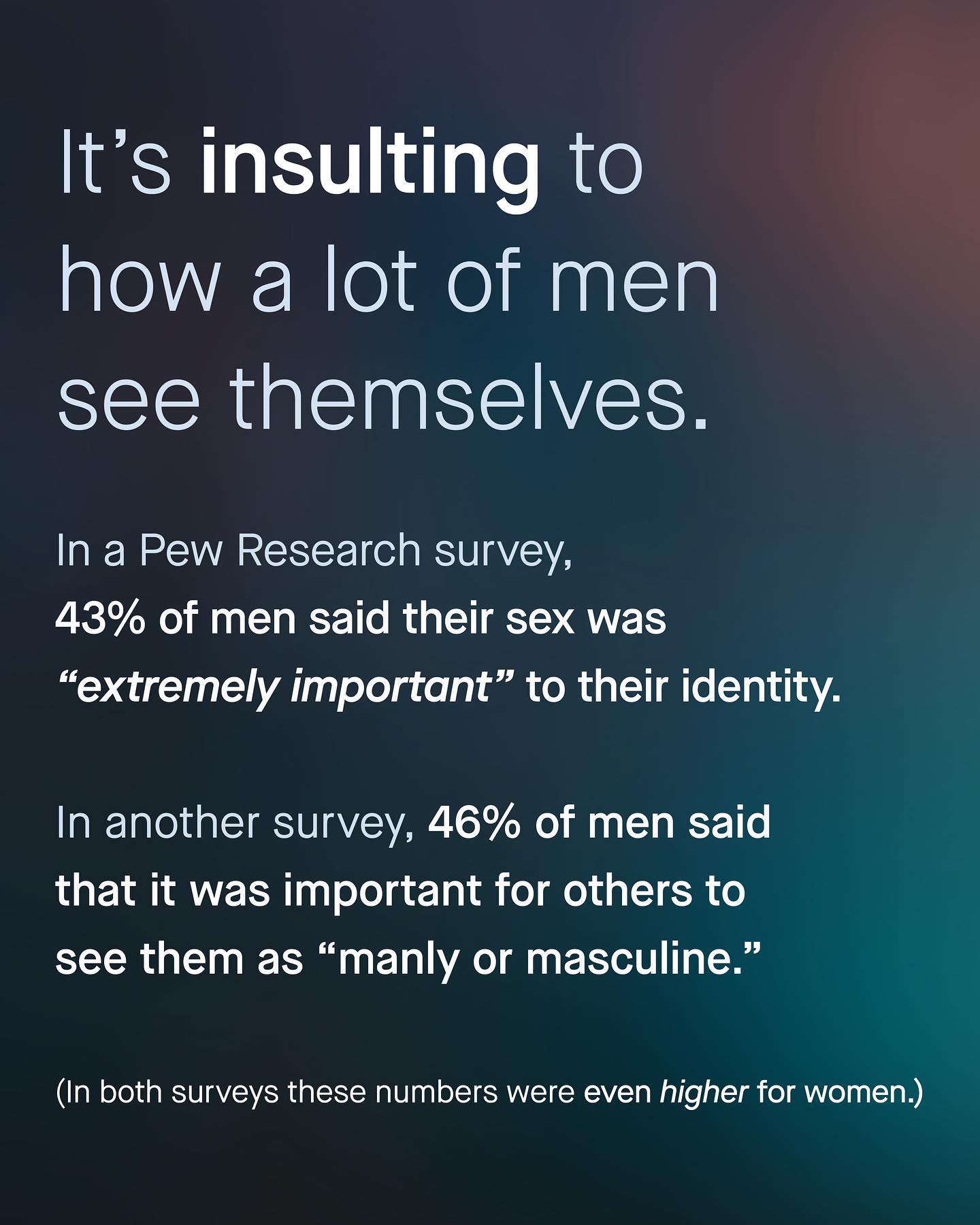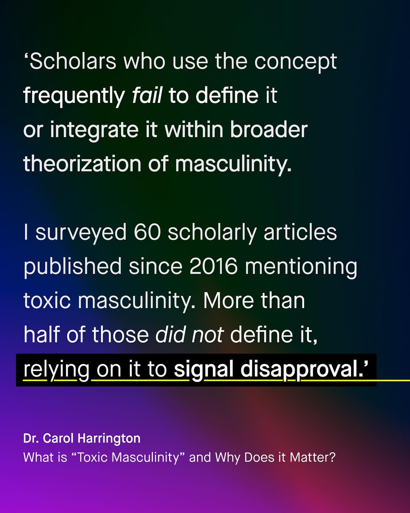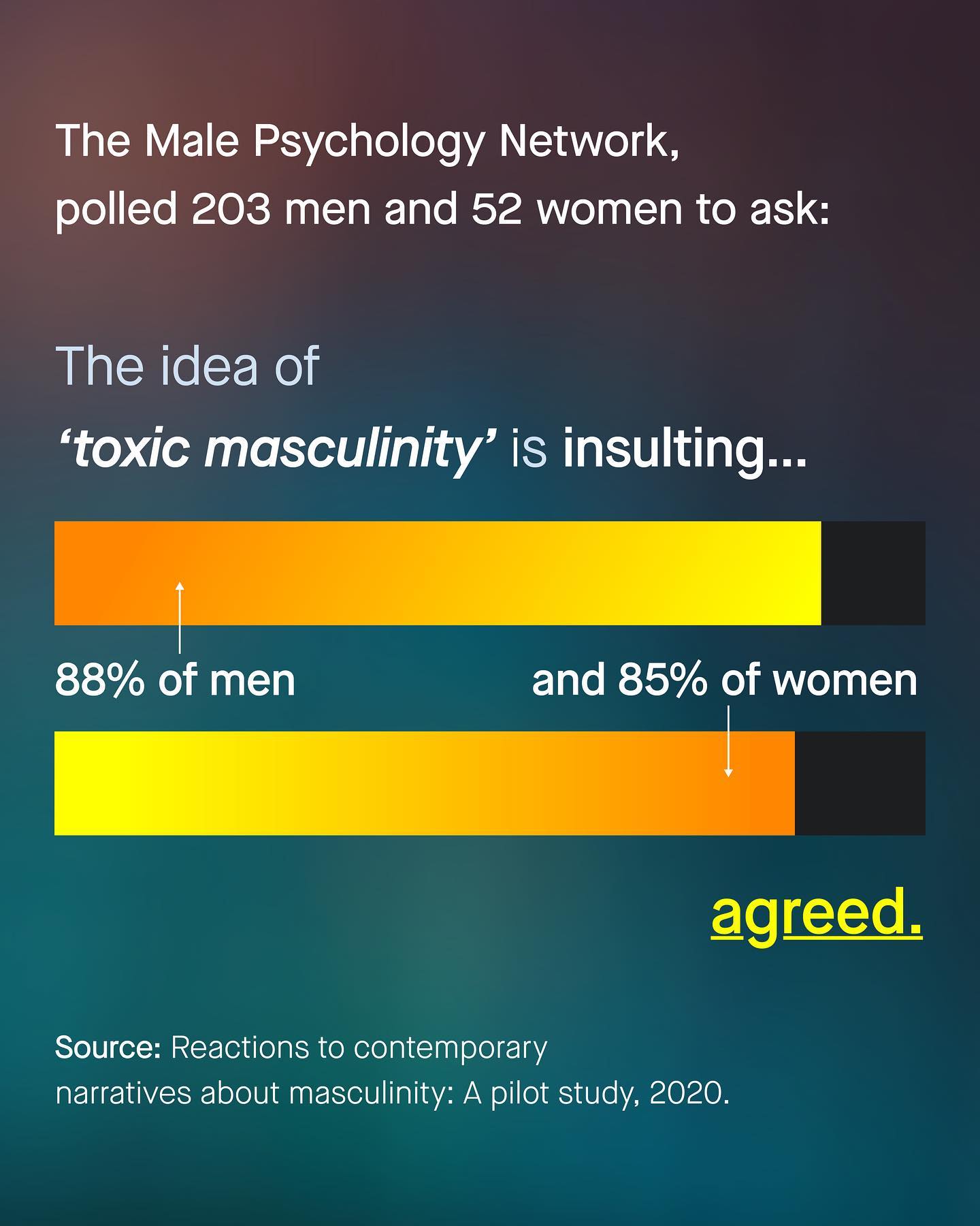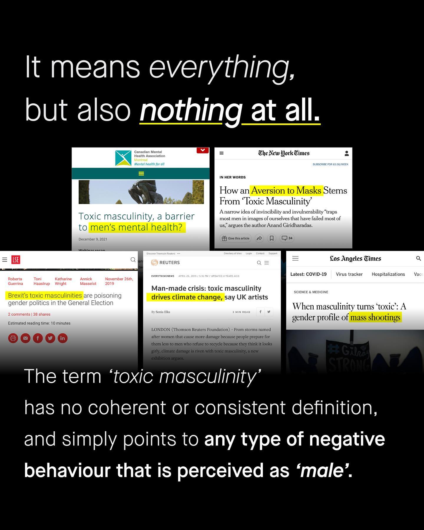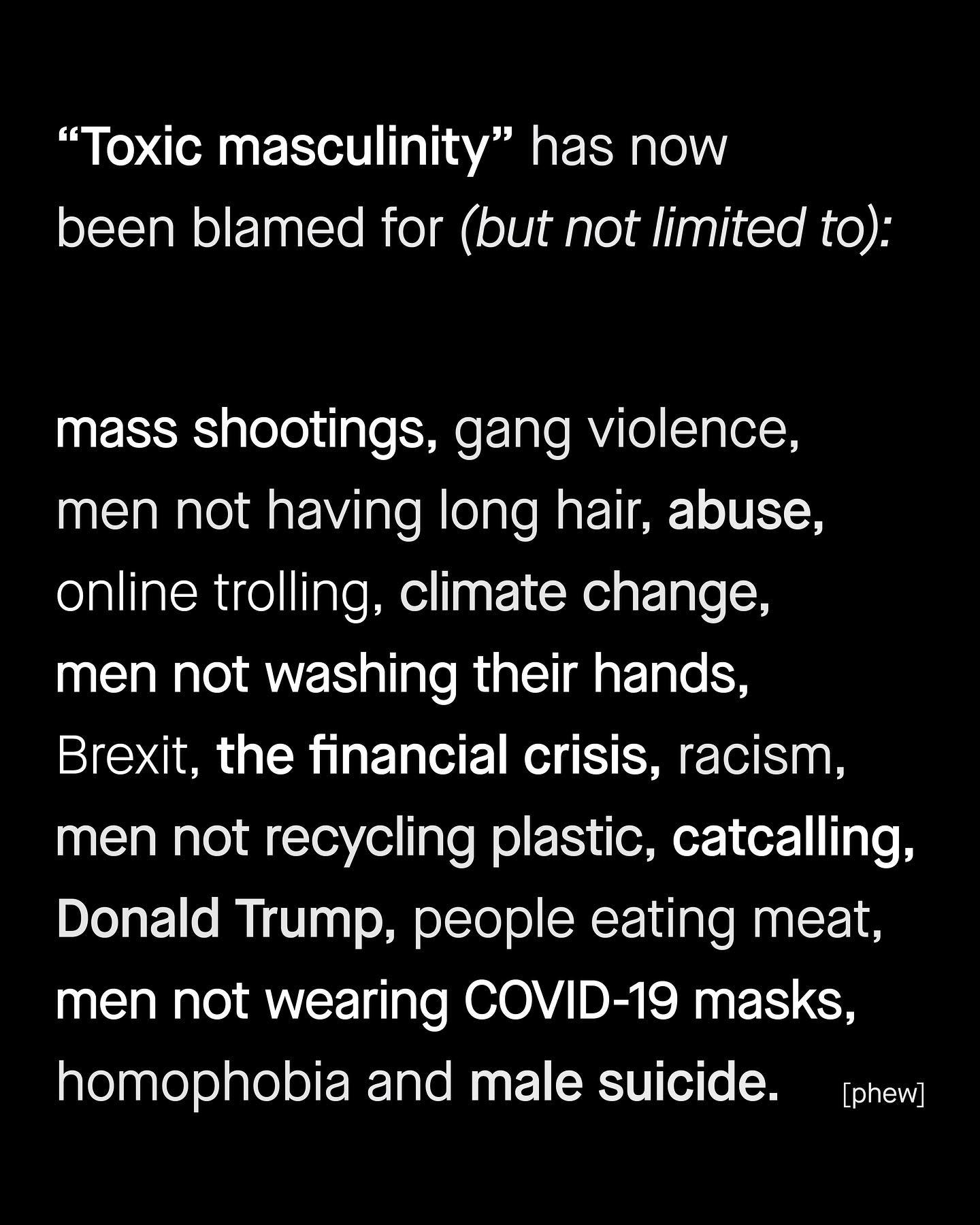 The problem with ‘toxic masculinity’ as a phrase, is that nobody knows what the hell you’re talking about. I have seen it simply everywhere. It’s why men don’t recycle plastic bags. It’s why others die by suicide. It’s why men don’t wear masks, or why they eat meat. It’s why the UK is leaving the European Union and it got Donald Trump elected. Apparently it’s driving global warming and it’s stopping men from washing their hands. It’s the explanation for gun crime, abuse and gang violence, and it crashed the economy in 2008. How could one thing do all this? How can something be the bane of men’s mental health, whilst also causing climate change and gun crime? It is a cringey, jumbled and incoherent mess. A word that simply maligns men and does its best to tie anything, and everything bad, to masculinity. No matter how tenuous or absurd. Whether it’s in the media, in politics, online or in scholarship – it is increasingly used to just signal disapproval of men, and nothing more. So often the first word in a diatribe of bigotry; it’s an insult, it’s inexcusable, it is ironically, toxic itself. And perhaps most shameful of all, is how it has sunk its insidious roots into the lower echelons of the psychological industry. With low effort professionals using such silly viewpoints, like snake oil, in the treatment and understanding of vulnerable men. Somehow to call a suicidal man ‘toxic’ is considered compassion, advocacy and even ‘treatment’ these days. So what does ‘Toxic Masculinity’ mean to you? And is it time to stop using it? ~ Source Dr Carol Harrington Pew Studies Write up Male Psychology Network Poll Helen Lewis Images by Gradient, Cesar Rincon, Olu Famule, and A-Z from Unsplash.