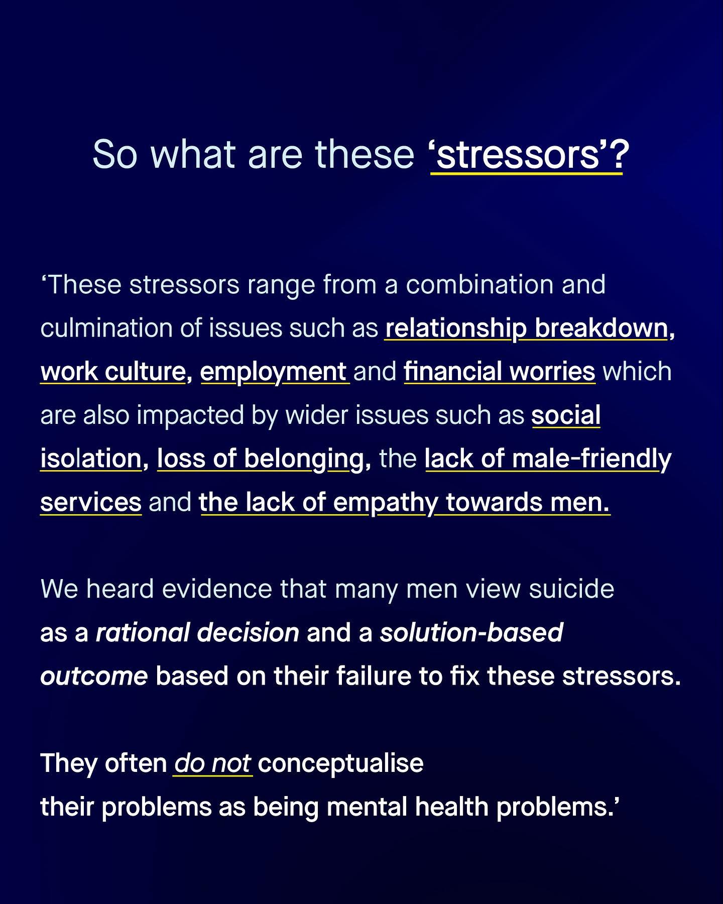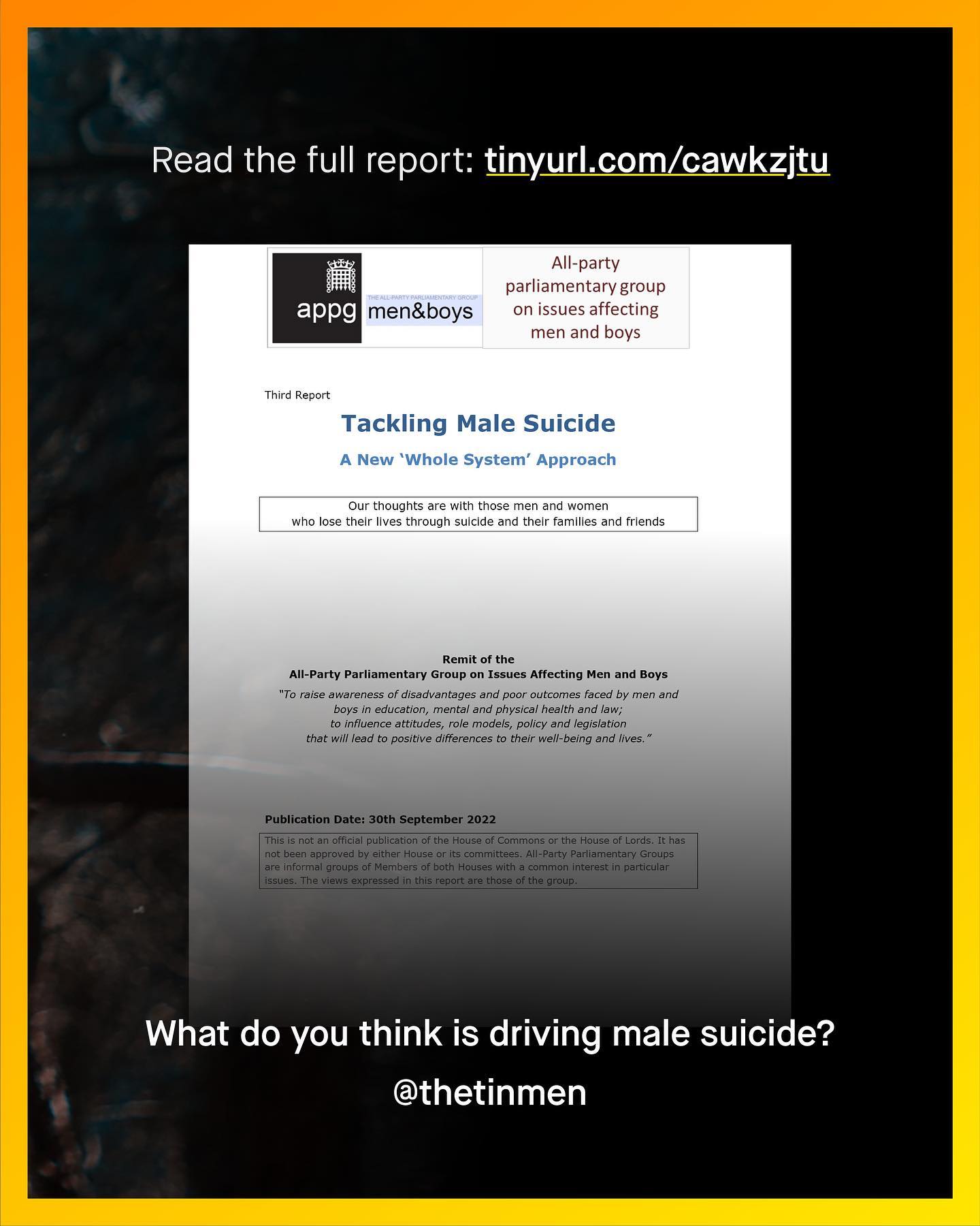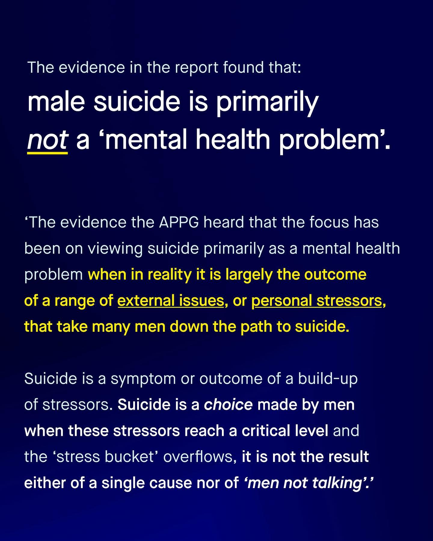I get sent reports, content and articles on #malesuicide, on a day to day basis. For the sake of my own mental health I don’t read them all, but those that I do are often saying the same thing: well meaning ideas, that look nice and sound good, but are largely toothless and ineffective. Many of them blame suicidal men for their own undoing, placing ownership for the problem squarely on their shoulders, with the solution being men’s responsibility. Many talk about suicidal men as if they are defective, or deficient somehow. Using some kind of ‘men are faulty’ model, that suggests if only they’d behave more like women, then the problem would surely disappear. Almost all of what I am sent views male suicide through the prism of mental illness, and totally ignores the wider structural, political, social and economic factors that shape many mens’ distress. I hear meagre calls for “talk”, which then go on to ignore the very words of suicidal men; who themselves *don’t* conceptualise their problems as being ‘mental health problems’. For many suicidal men, being in debt or losing your home isn’t a mental health problem. Neither is becoming unemployed, being in an abusive relationship, Adverse Childhood Experiences, or losing custody of your children. And yes, these are some of the biggest contributors to the staggeringly high male suicide rate, that nobody is talking about (including advocates themselves). Page after page, post after post, it is often baseless accusations, or blind assumptions, or downright denial. That was until an exciting 2022 report landed in my inbox The new APPG on Men and Boys’ report on male suicide, consisting of many of the top male psychology experts around the world, all feeding into a comprehensive, enlightening, and extraordinarily validating report that blows the lid of the issue. I can’t possibly include it all in here - so I encourage you to read it for yourself. So a hat do you think is driving male suicide? ~ APPG Men and Boys: Male Suicide Images by Gradienta, Kelly Sikkema, Some Tale, and Background on Unsplash. #malesuicideawareness #suicideprevention #mensissues #fathersrights