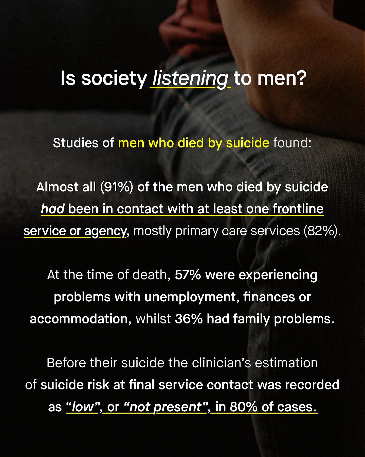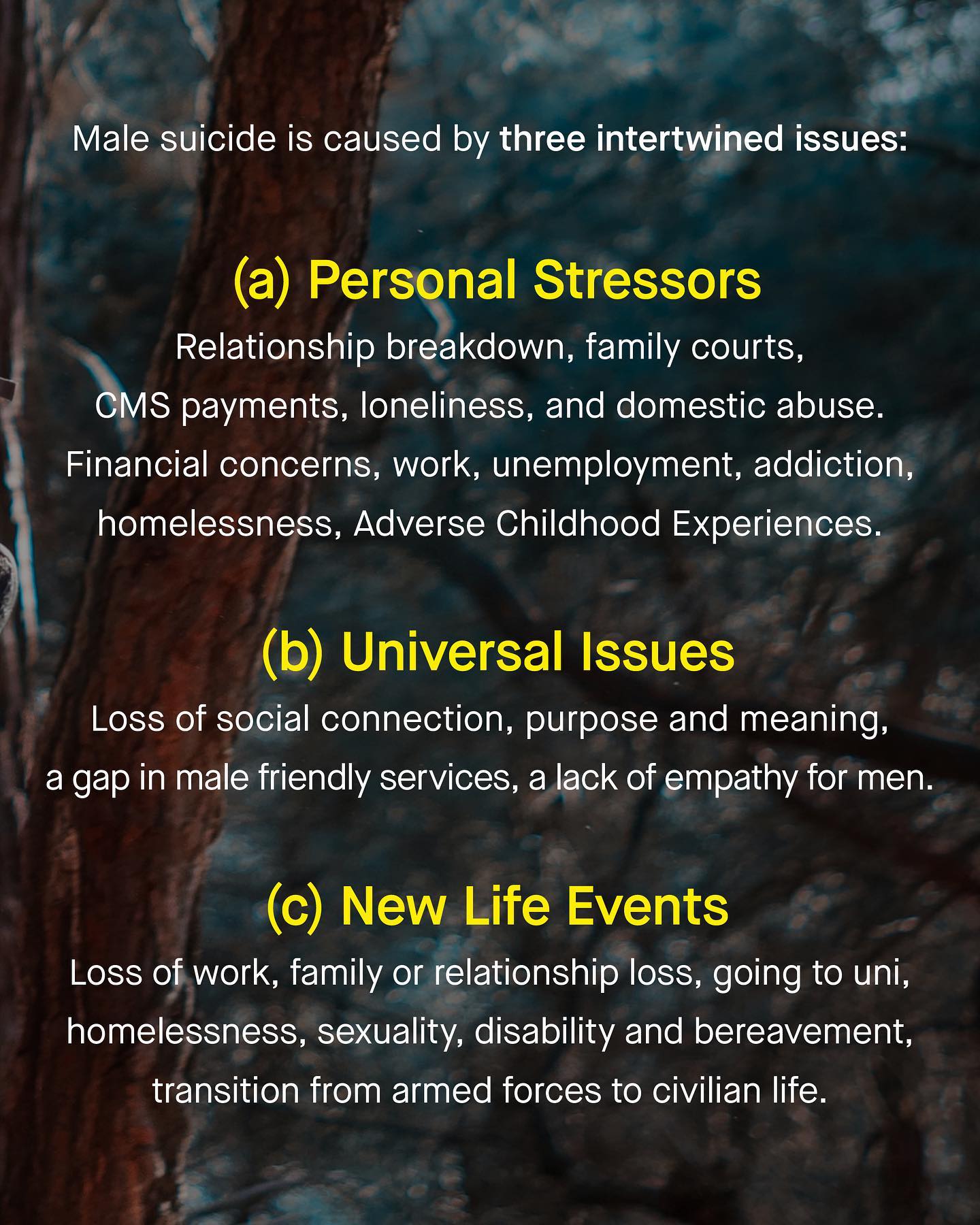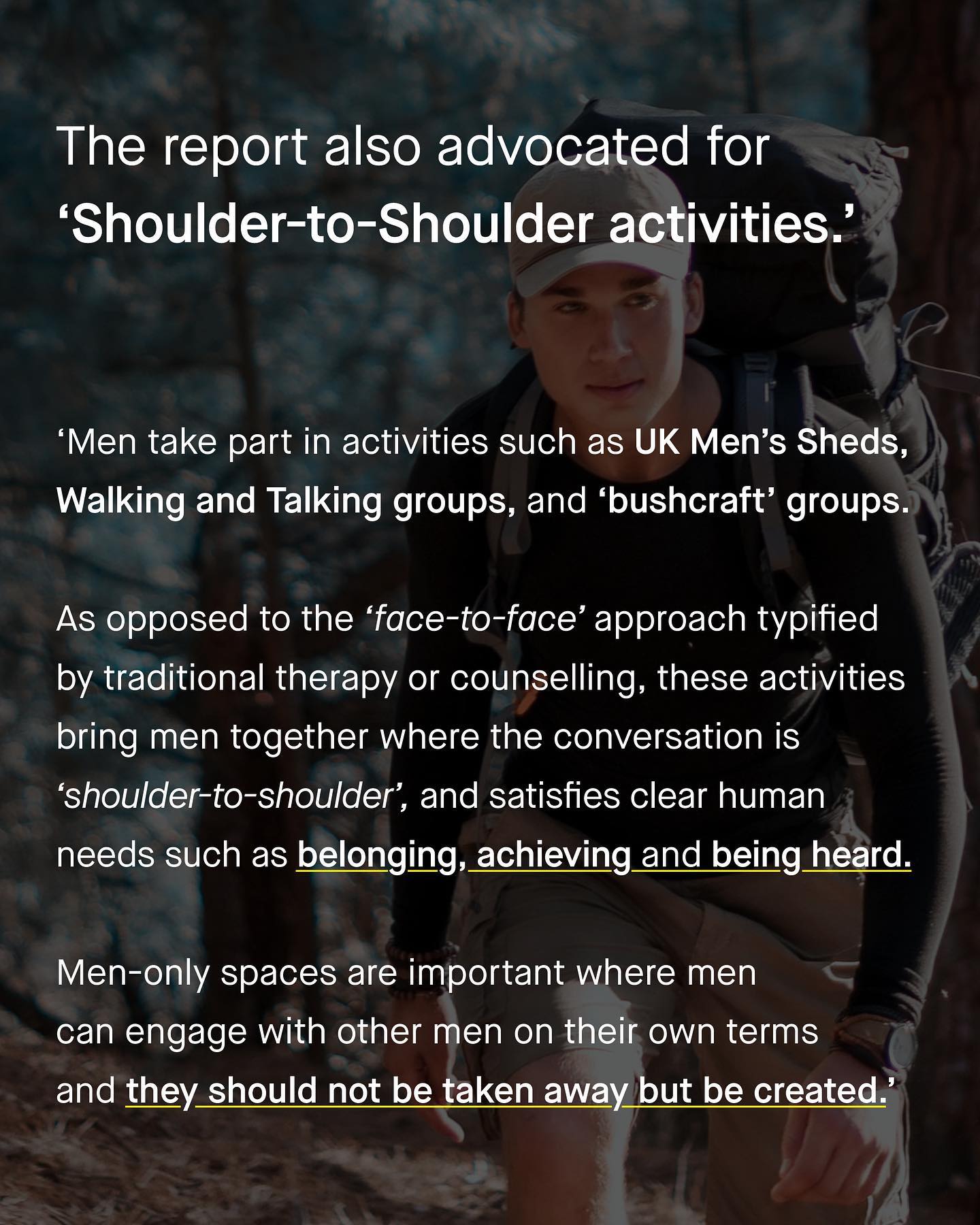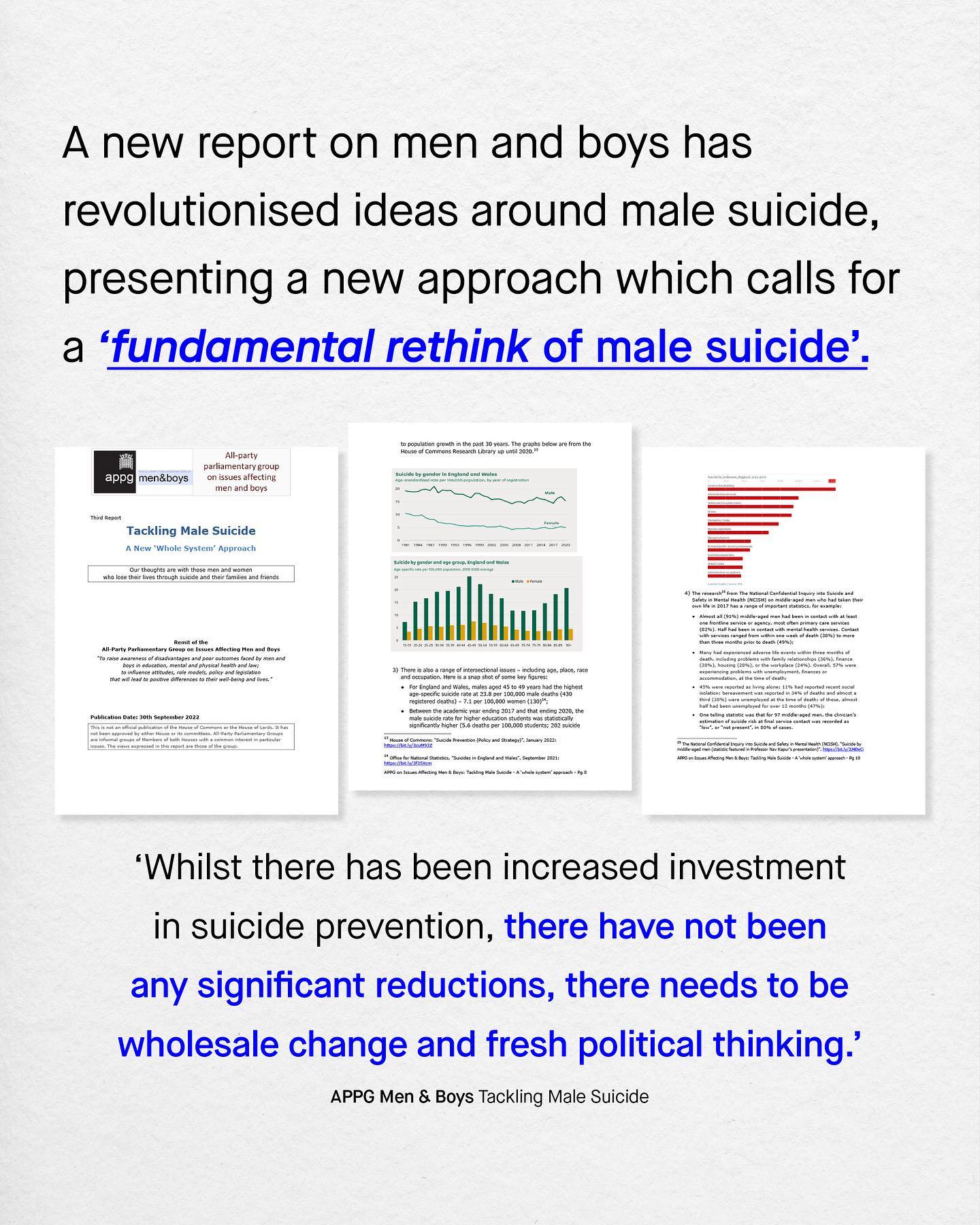 I get sent reports, content and articles on #malesuicide, on a day to day basis. For the sake of my own mental health I don’t read them all, but those that I do are often saying the same thing: well meaning ideas, that look nice and sound good, but are largely toothless and ineffective. Many of them blame suicidal men for their own undoing, placing ownership for the problem squarely on their shoulders, with the solution being men’s responsibility. Many talk about suicidal men as if they are defective, or deficient somehow. Using some kind of ‘men are faulty’ model, that suggests if only they’d behave more like women, then the problem would surely disappear. Almost all of what I am sent views male suicide through the prism of mental illness, and totally ignores the wider structural, political, social and economic factors that shape many mens’ distress. I hear meagre calls for “talk”, which then go on to ignore the very words of suicidal men; who themselves *don’t* conceptualise their problems as being ‘mental health problems’. For many suicidal men, being in debt or losing your home isn’t a mental health problem. Neither is becoming unemployed, being in an abusive relationship, Adverse Childhood Experiences, or losing custody of your children. And yes, these are some of the biggest contributors to the staggeringly high male suicide rate, that nobody is talking about (including advocates themselves). Page after page, post after post, it is often baseless accusations, or blind assumptions, or downright denial. That was until an exciting 2022 report landed in my inbox The new APPG on Men and Boys’ report on male suicide, consisting of many of the top male psychology experts around the world, all feeding into a comprehensive, enlightening, and extraordinarily validating report that blows the lid of the issue. I can’t possibly include it all in here - so I encourage you to read it for yourself. So a hat do you think is driving male suicide? ~ APPG Men and Boys: Male Suicide Images by Gradienta, Kelly Sikkema, Some Tale, and Background on Unsplash. #malesuicideawareness #suicideprevention #mensissues #fathersrights