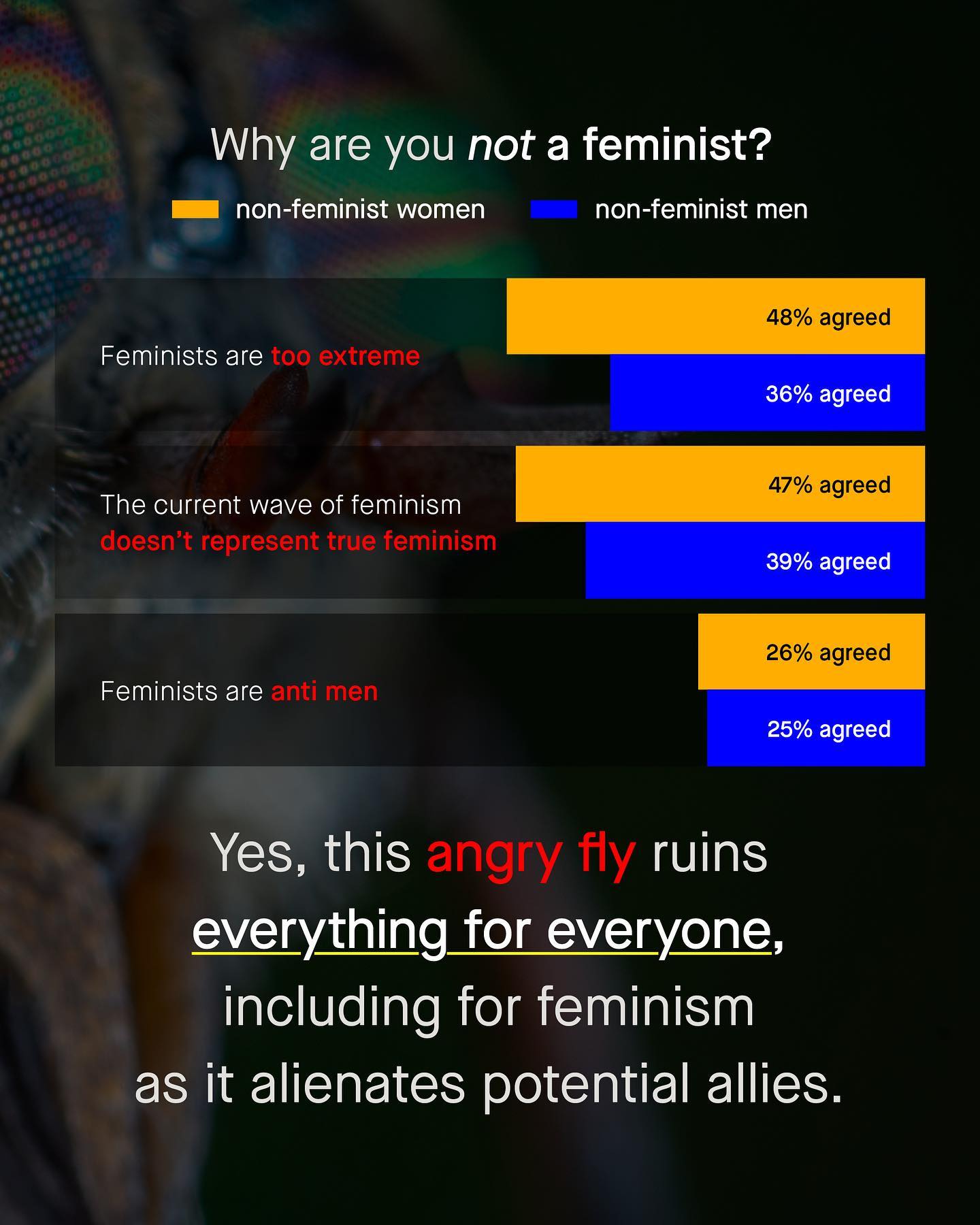 When it comes to the essential conversations of women’s rights, there’s a fly in the ointment. An angry and persistent fly; that instead of advocating for women and girls, seems more interested in whining, ranting and shaming men, pathologising masculinity, and dominating the conversation with a host of conspiratorial gender theories. An ugly bug that spits hashtags and blames ‘men’, whose vitriol has buzzed in the ear of well meaning discourse for decades. The annoying fly. The radical. The brittle whino. It is a fly, that although a minority, is disproportionately loud and is able to destabilise even the most well meaning of advocacy, impede progress and stoke the fires of division. Yes. Described as ‘anti male’, or ‘too extreme’, the fly ruins the profile of women’s rights for everybody, driving a wedge between men and the women, and making enemies of allies. I am talking about radical feminism. Radical feminism whose unaddressed anti male bigotry provokes a gender war, causes outrage, and whose childish slogans push men *away* from supporting women’s rights. I am one of those men. I am, and always will be, a passionate supporter of women’s rights, a lover of women, and a pro choice advocate. But I am dismayed at how often well intended conversations become hijacked by overt and unhelpful anti-male sentiment. Sadly, as always, the few ruin it for the many. So I ask, does radical feminism hurt the profile of women’s rights? What do you think? ~ Why are you not a feminist Attitudes to abortion by sex Images by Images by Moderat, Neauthy Healthcare, Gemma Chua Tran, Ekemelev, and Kiwi Hug from Unsplash. #womensrights #feminism #mensissues #prochoice
