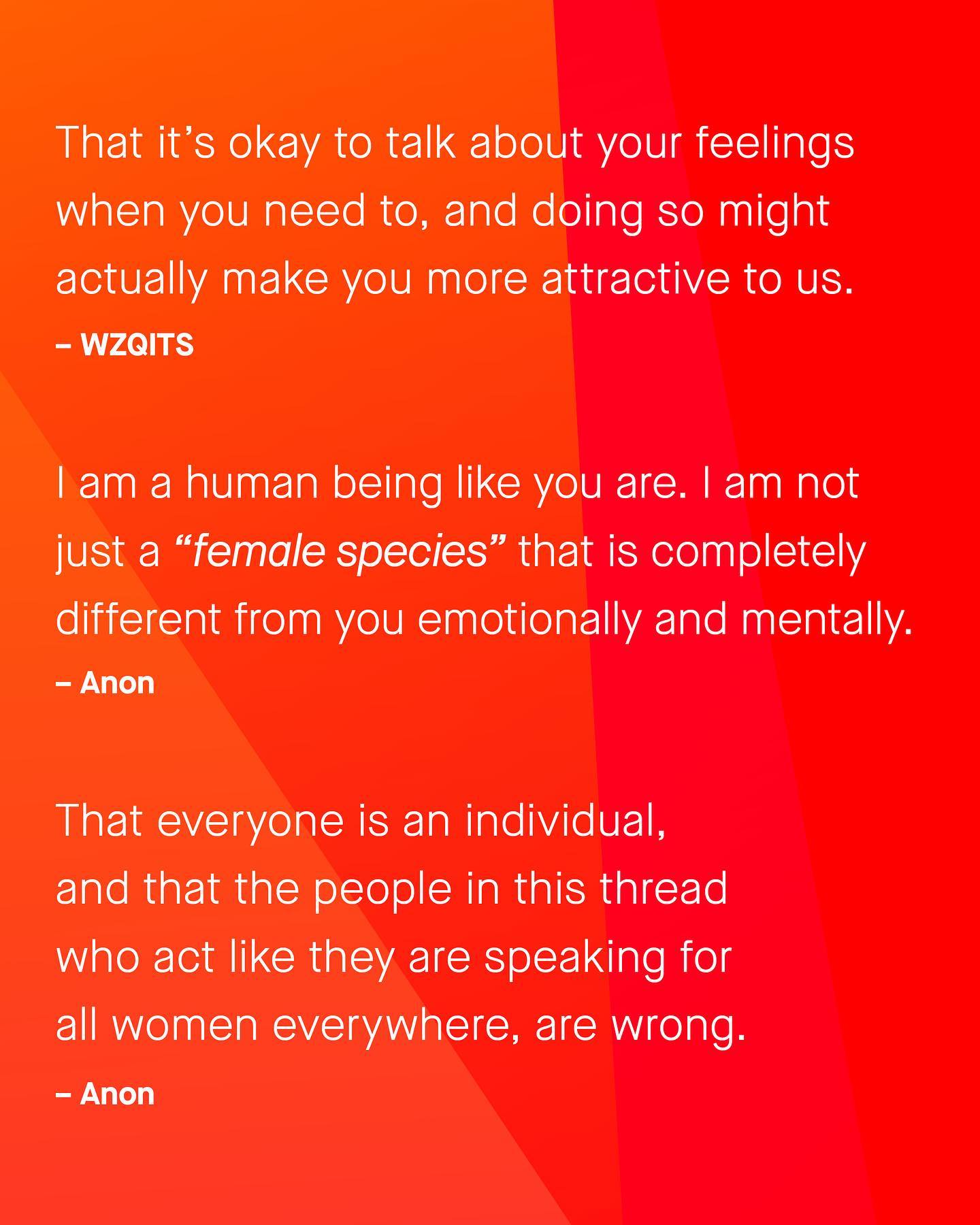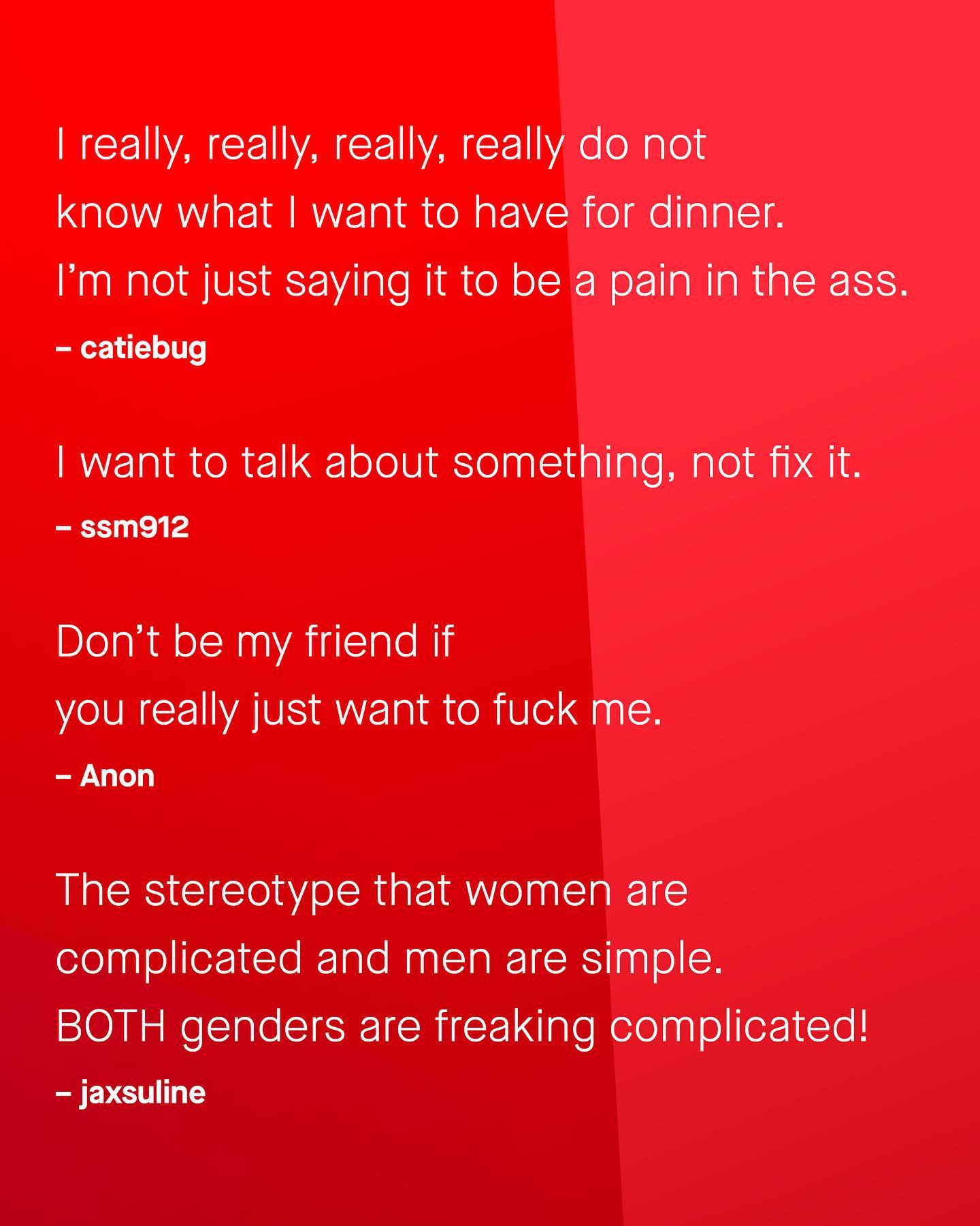 Last week I asked the guys what they wanted women to know about men, and I saw lots of wonderful conversation in the comments. Now it’s time we flipped the script. So women, what do you want men to know? ~