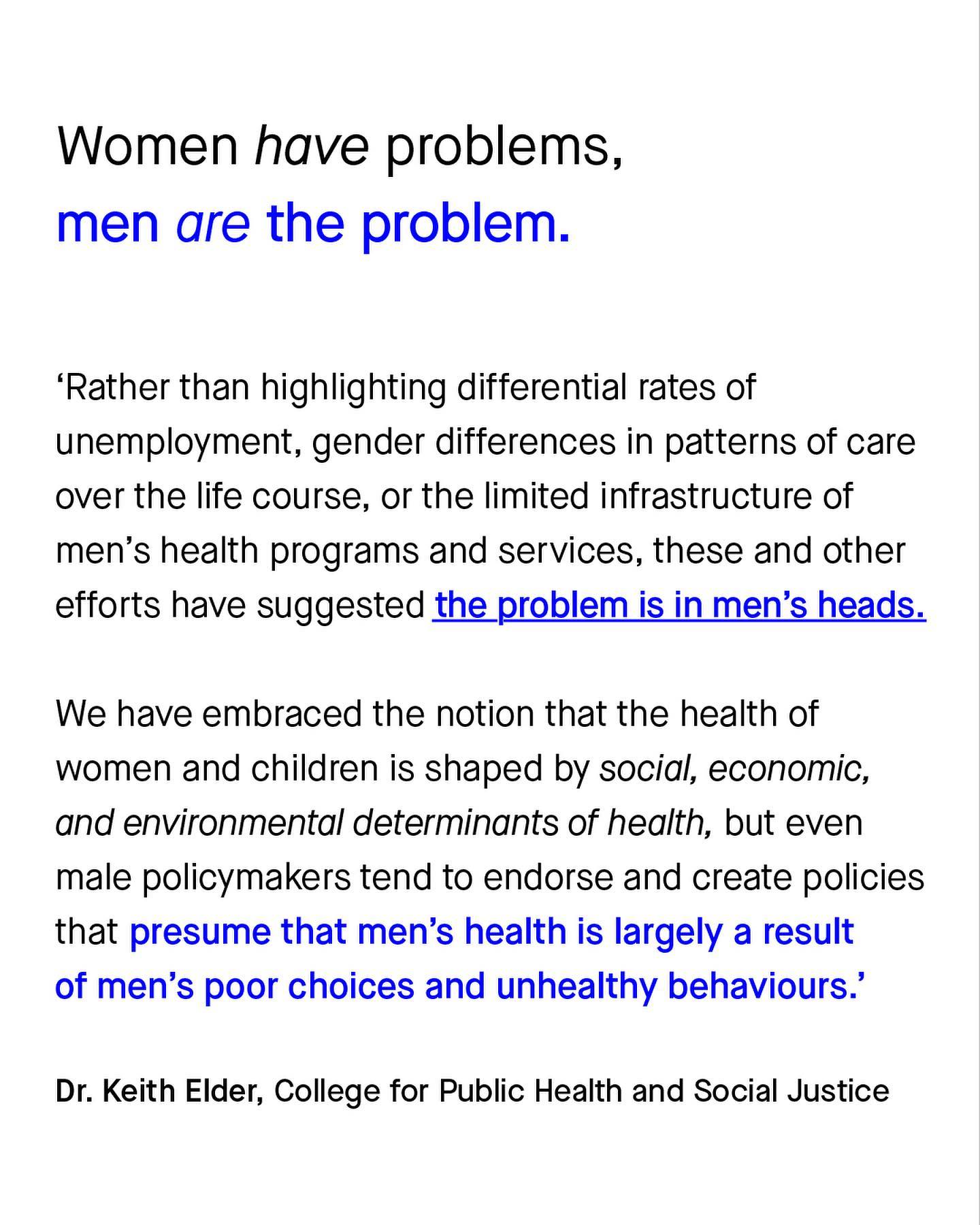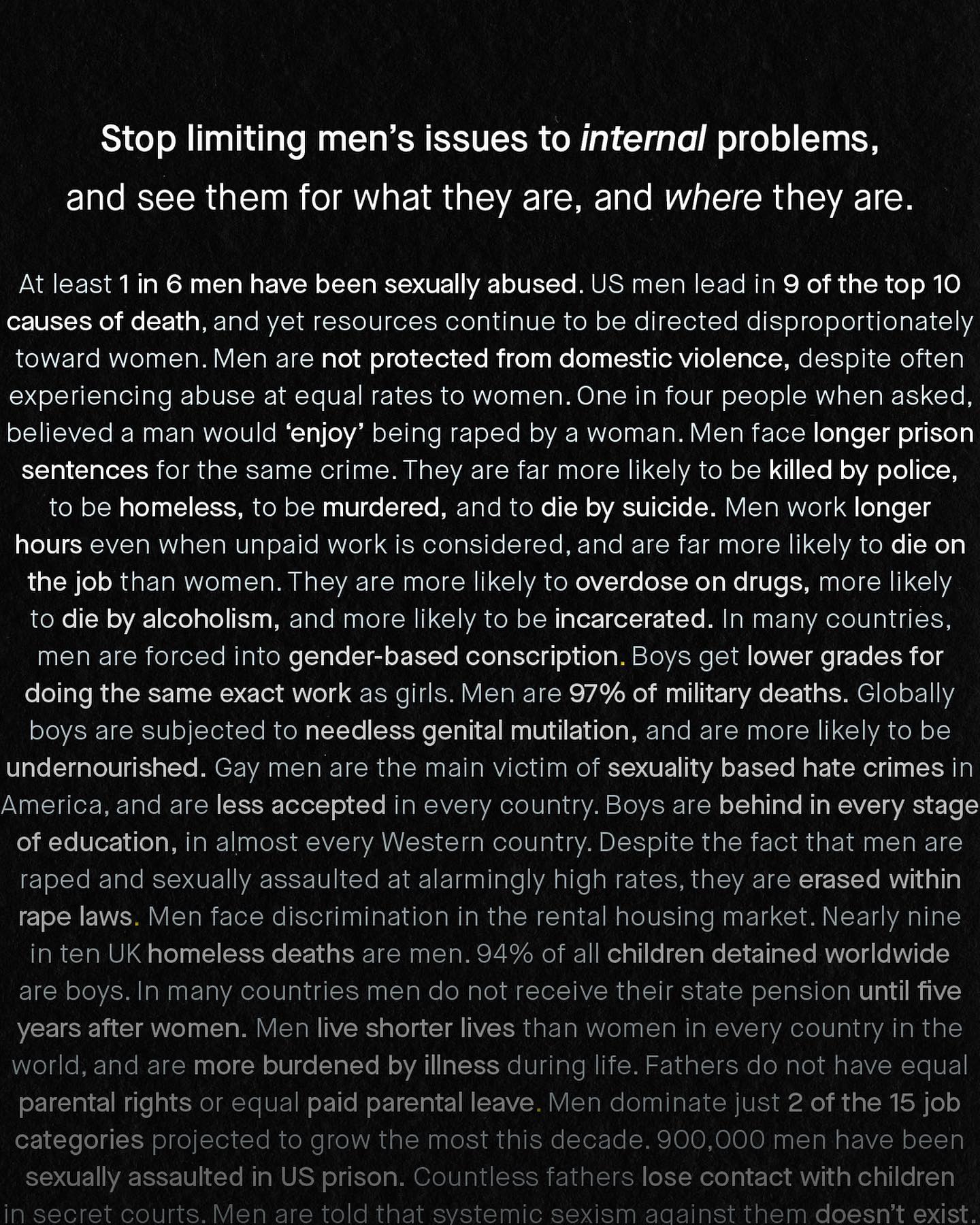 We have arrived at a point of social advocacy, that provides a beautifully nuanced and rich analysis of women’s issues. And yet one word simplistic solutions for men, laden with shame and condemnation. We know that women’s issues are shaped by social, economic, structural, political and environmental factors; and their behaviour, including criminal behaviour, influenced by their experiences, their childhood and their traumatic past. But men’s problems are their own, and only they can solve them. Their behaviour, especially criminal behaviour, is a consequence of their gender, and their experiences are inconsequential (men don’t have problems, didn’t you know?) In nutshell – women *have* problems, men *are* the problem. When women have issues we rightly ask ‘how can we fix society?’ But when men have issues, we ask ‘how can men fix themselves?’ And it is this narrow and harmful mindset that has led the world to grapple with highly problematic ideas such as ‘toxic masculinity’. A concept that limits men’s issues to internal problems, and presents a mere change of problematic male mindset as the answer. It gaslights men. Cry a little, talk more, stop being a total piece of shit, and you’ll be just fine guys! Who cares about your past, who cares about your trauma, who cares about the structural and societal problems that impact you, and which shape your distress. For we have bought into a dogmatic patriarchal worldview that cannot (and will never) be able to reconcile such systemic male disadvantages and pain, so we’ll just deny it exists. So is it time we brought the same richness and complexity to how we view men’s issues? Is it time we extended the same level of compassion to men, as we already do to women? Is it time we ended discourse around #toxicmasculiunity? ~ Images by Black Kiwi Hug, Marie Michele Bouchard, Amir Riazipour, Kiki Hug, from Unsplash. Illustration by Hey Rabbit #mensmentalhealth #menshealth #malesuicideawareness #malesuicide