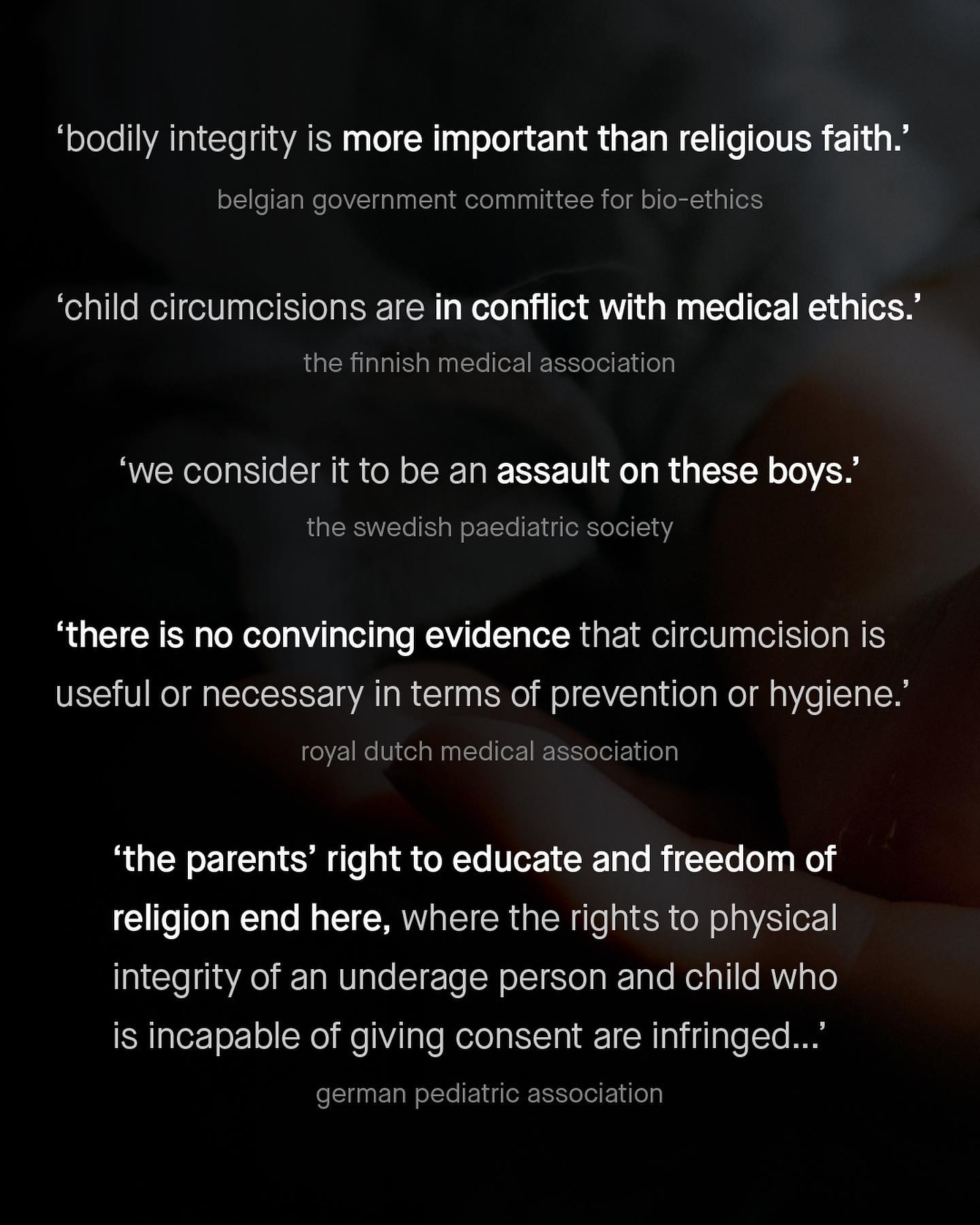 Sometimes I think we’re making progress for men and boys, sometimes I feel differently. Sometimes when it comes to the most fundamental, sacred and precious rights of all, that of bodily autonomy, to see it so wilfully invaded, on babies no less, and violated by those entrusted to protect that baby, and for this to happen to millions of babies with the wilful ignorance and negligence of the law… …well it leaves little to feel positive about. Worse are the reasons I read for such an abuse of children – “it looks better”, “he’ll be like his dad”, or even “well it’s just cleaner”, are excuses so far from being valid, that they make me wince, cringe and hang my head in despair. And no, it’s not cleaner. In fact, the foreskin offers important properties to protect the glans and urethra, and well as powerful natural immunological properties to further guard the body from infection. Even if it was ‘more hygienic’, are we seriously advocating we cut body parts off babies, to avoid educating that child on basic cleanliness? And why stop there? The human body comes with many difficult to reach spots, nooks and crannies, and hidden areas… Are we to start cutting those off too? What is the cure to dandruff I wonder? Cutting off your own head? Beneath the nonsense, for which their really ought to be no sense of humour, circumcision is violation of human rights, and an abandonment of a parents duty to protect their own child. It is accepted, both legally and socially across the world, with no laws banning it or agencies calling for such laws. It is practiced not on thousands, or millions, but on over a billion men and boys globally. And whilst the world is slowly waking up to what circumcision is, a barbaric practice originally introduced to stop boys from masterbating, the slow drop in favour isn’t happening fast enough. So what will it take to open our eyes? What will it take to stop us circumcising our boys, without medical need? ~ [1] [2] Images by Sakura L, Alecsander Alves, Franco Antonio Giovanella, Abdulla Ali, Engin Akyurt, and Omar Lopez. #intactivist #intactivism #intact #circumcision